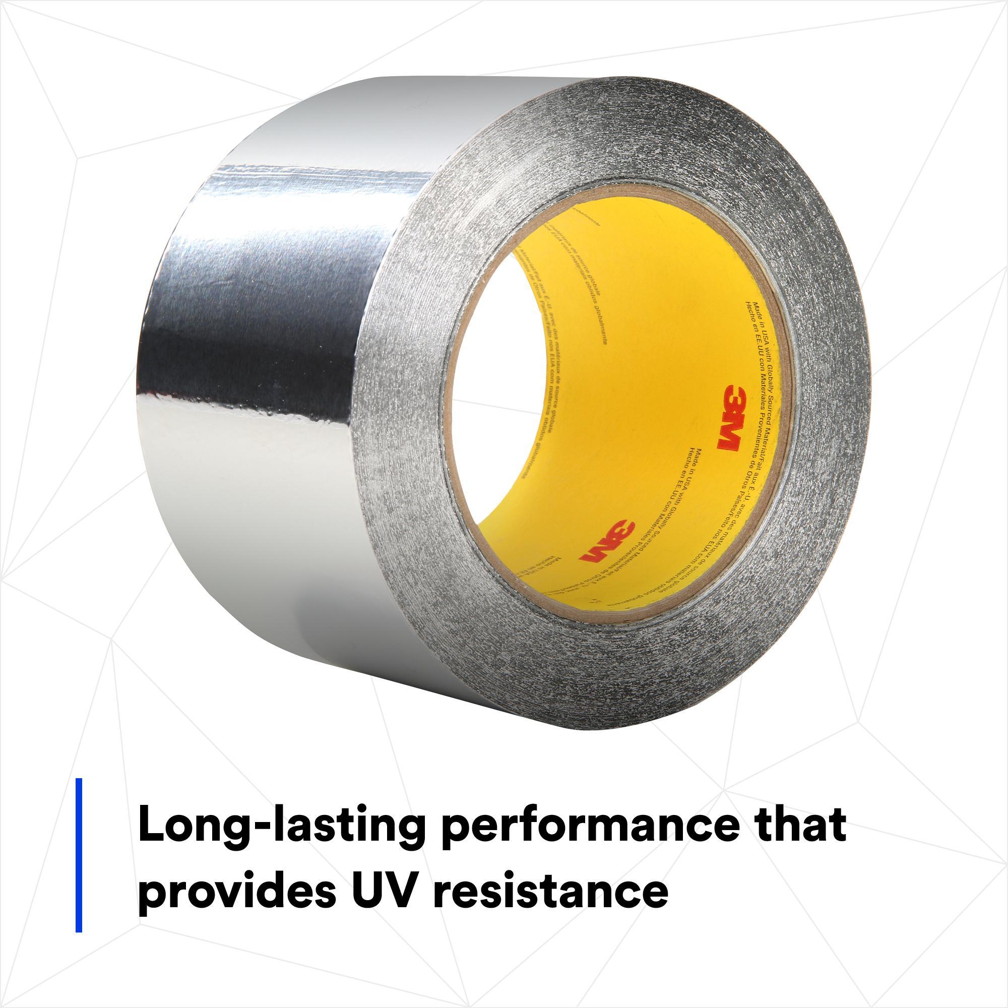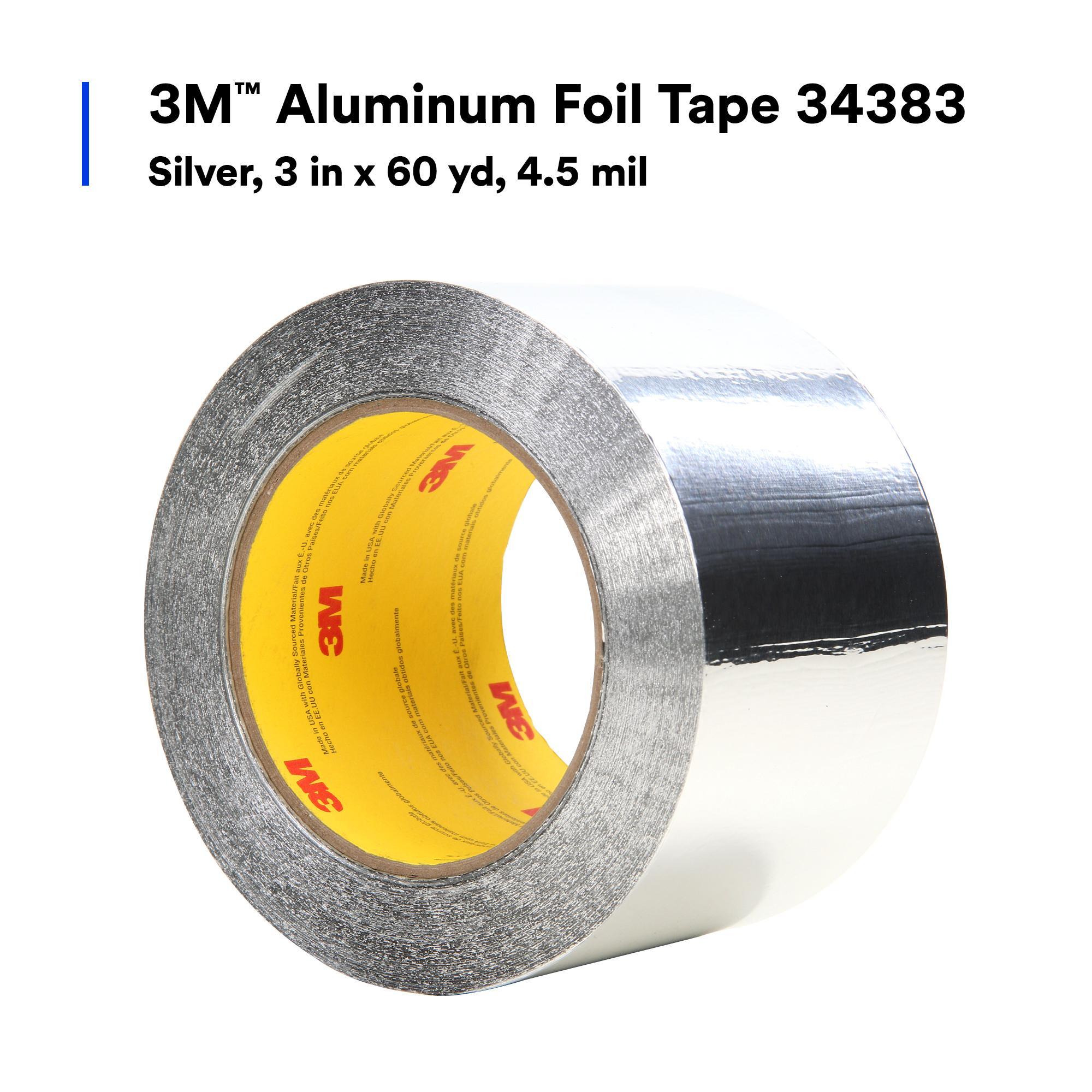 - Adhesion Strength:55 in-ozAdhesive Material:AcrylicBacking Material:Aluminum FoilColor:SilverLength:60 ydMaximum Operating Temperature:260 deg FMinimum Operating Temperature:-40 deg FSeries:34383Tensile Strength:30 lb/inThickness:4.5 milType:High StrengthWidth:3 in