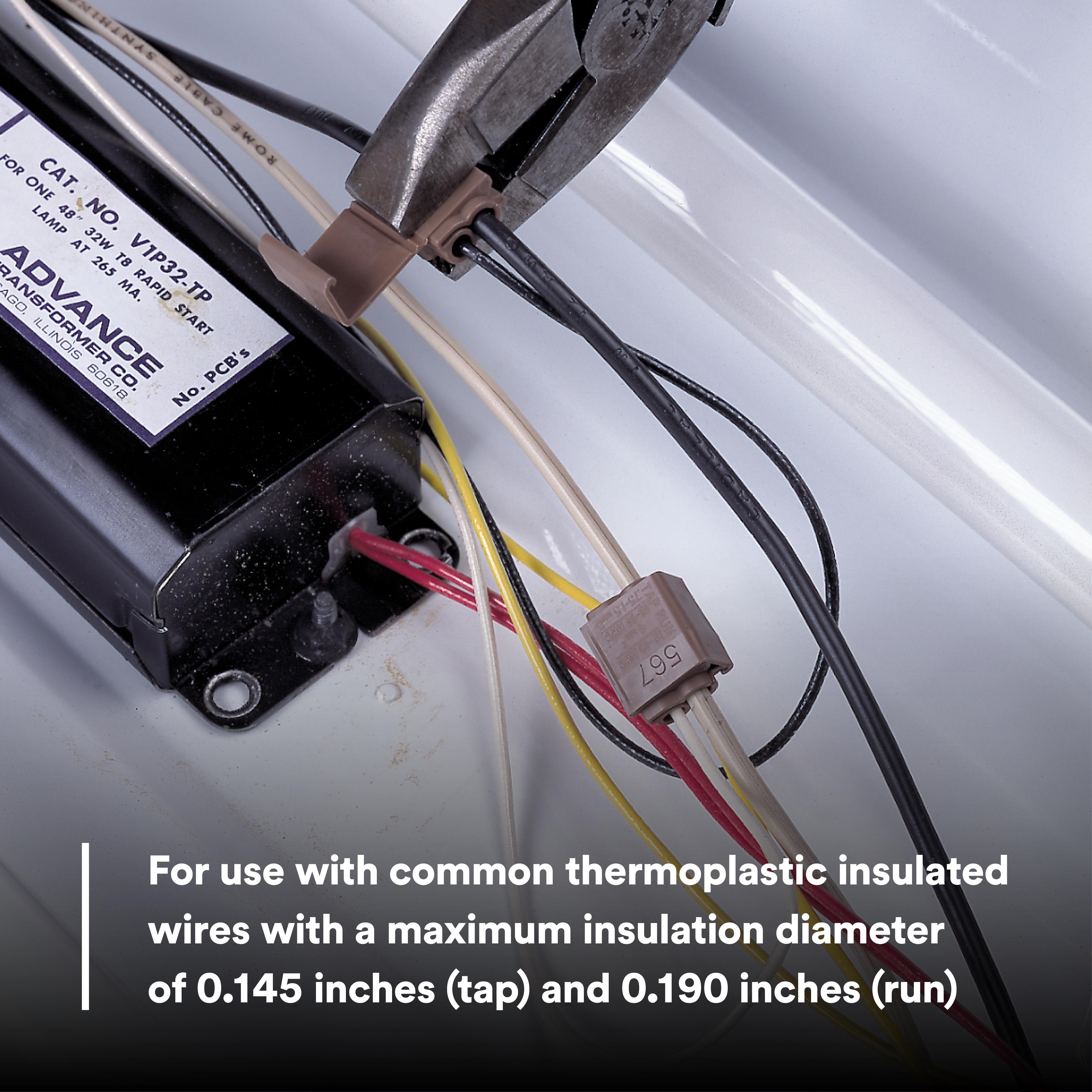 - Color:BrownCountry of Origin:USFinish:Tin-PlatedInsulation Type:PolypropyleneManufacturer Name:3MMaterial:BrassSeries:567-BINSpecifications:0.19 in Dia (Run) Max Insulation, 2 CoresTemperature Rating:105 deg C, 221 deg FType:Dual Element Connection Flame-Retardant, Run and TapVoltage Rating:600 V, 600 V ACWire Size:10 to 14 AWG (Tap), 12 to 10 AWG (Run), 18 to 14 AWG (Tap), 12 to 10 AWG (Run)Wire Type:Solid/Stranded
