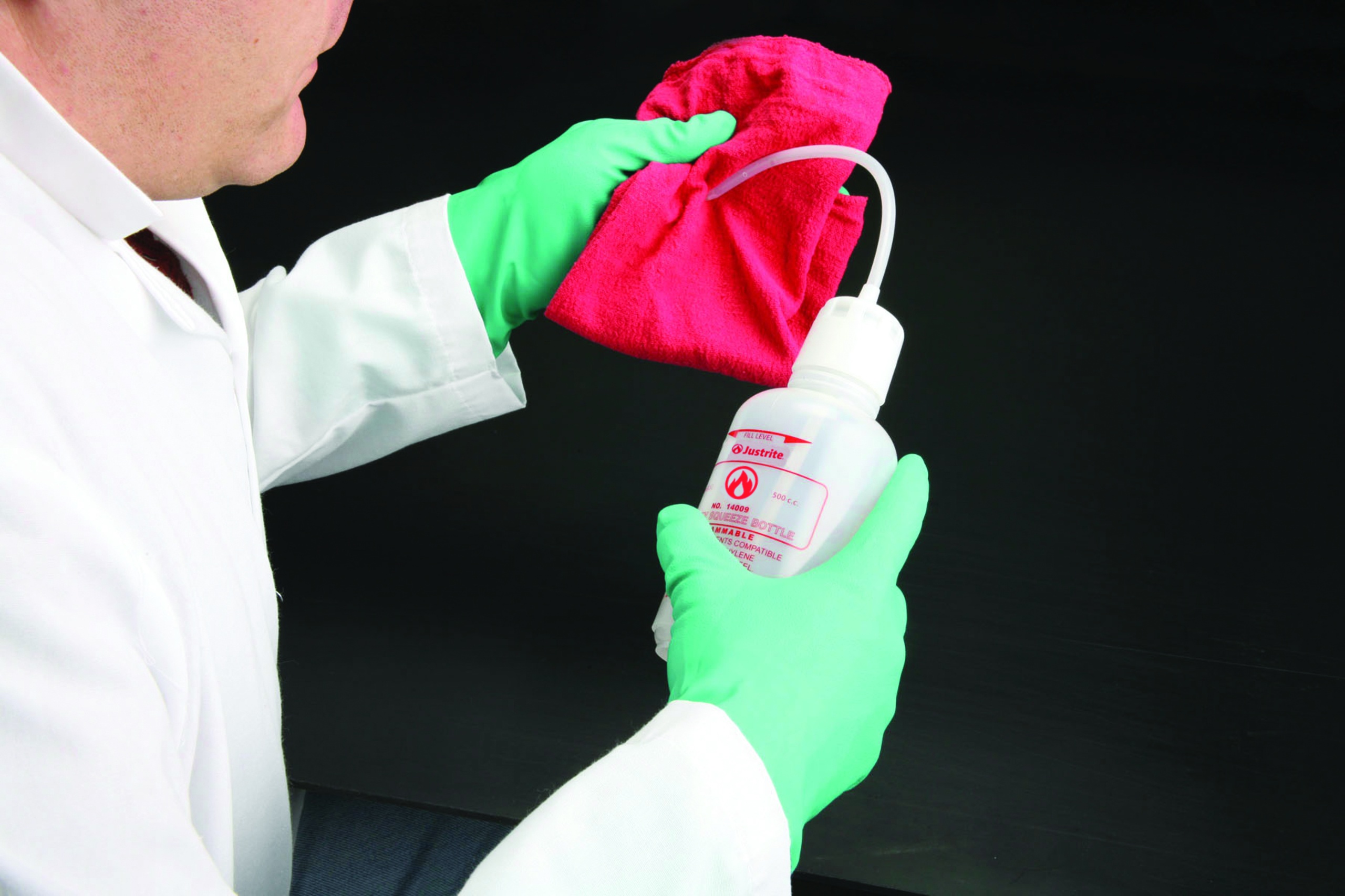 - Squeeze bottles made of polyethylene with a stainless steel wire, provide safe dispensing of flammable liquids directly on small components or subassemblies with a minimum of over spray