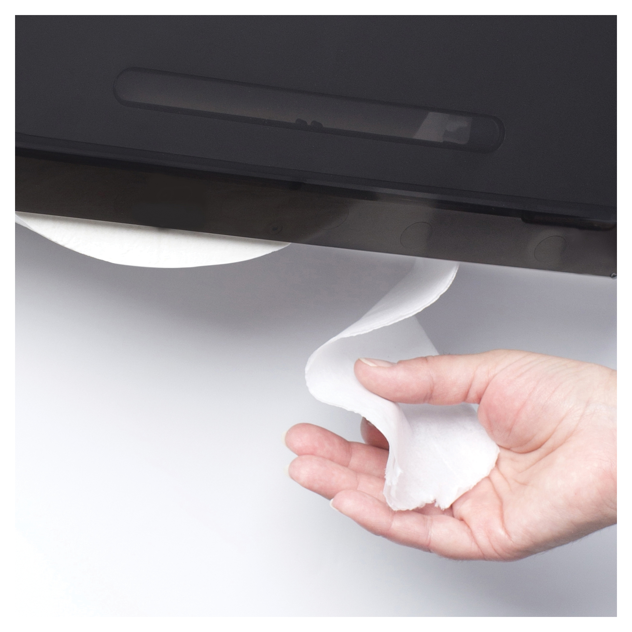 - Manual dispensing of 2 cored toilet paper rolls either two JRT Jr. rolls (two full 9.38 in Dia) or one JRT Sr. roll (13 in Dia) and a stub roll