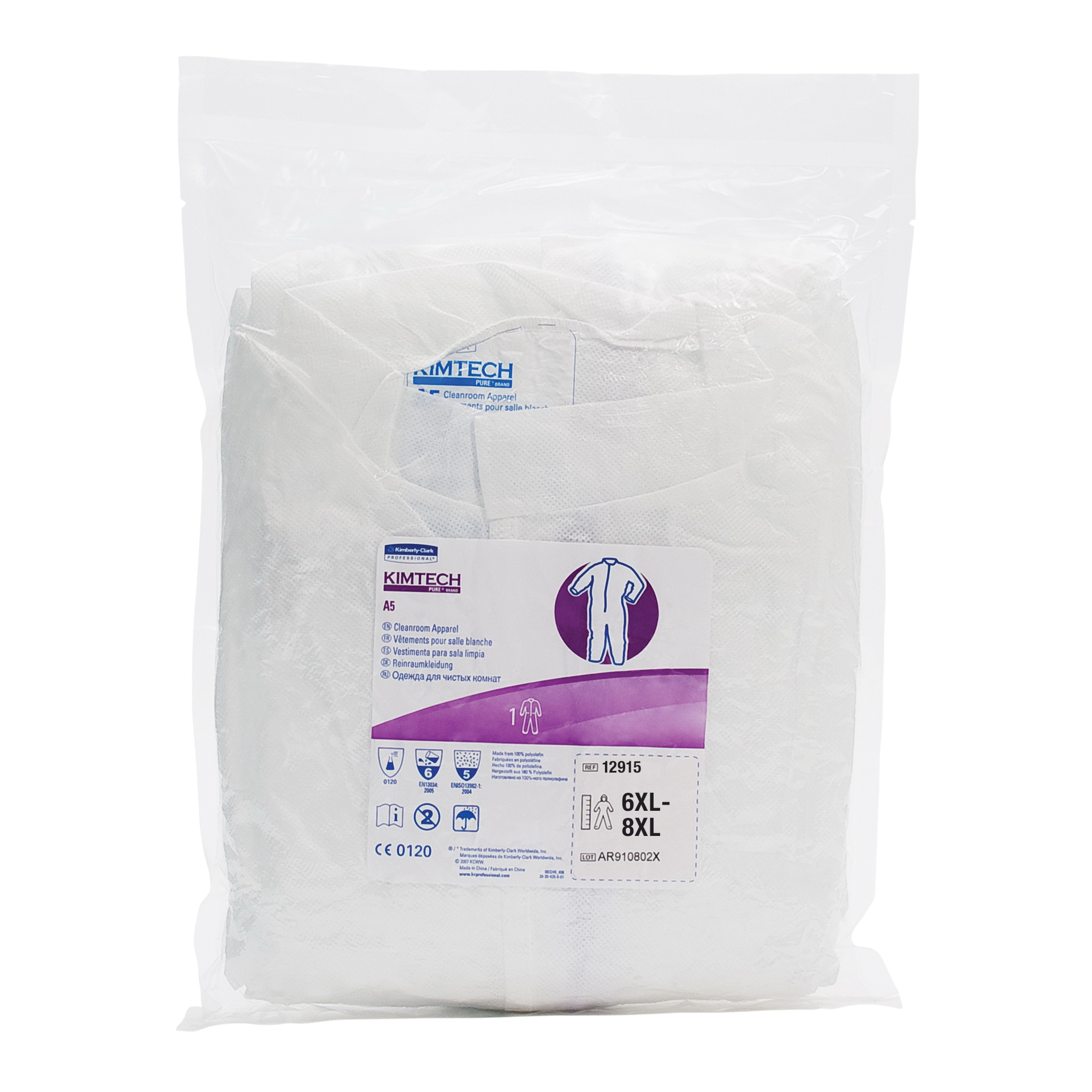 Kimtech* 12915 A5 Non-Sterile Cleanroom Coverall, 6XL to 8XL, White, SMS Fabric