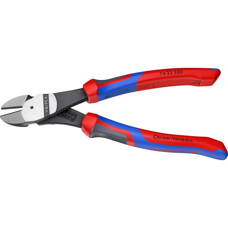 Knipex 74 22 200 High Leverage Diagonal Cutting Plier, 11/64 in Dia Medium Hard, 1/8 in Dia Hard, 3/32 in Dia Piano Wires Nominal, 7/8 in L x 1-1/8 in W Angled/Oval Jaw, 8 in OAL, Beveled Cut, DIN ISO 5746
