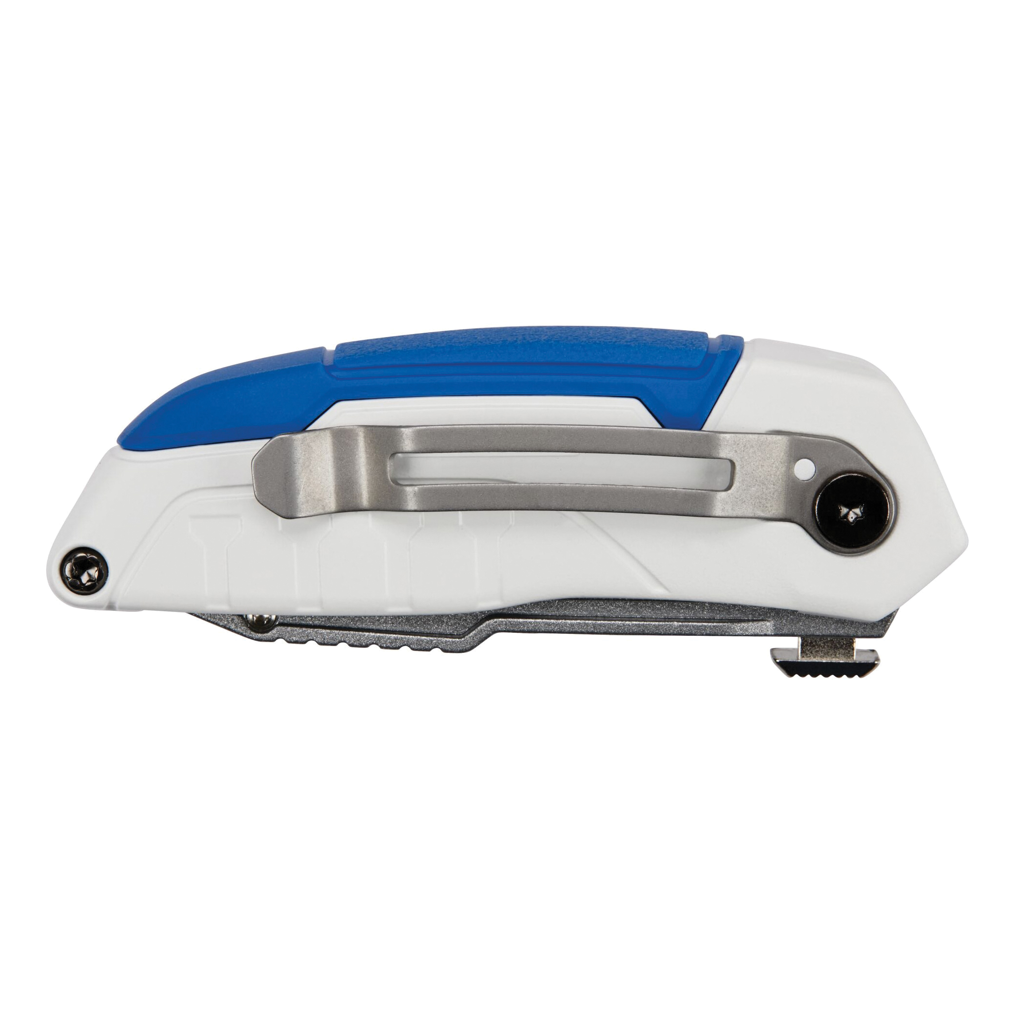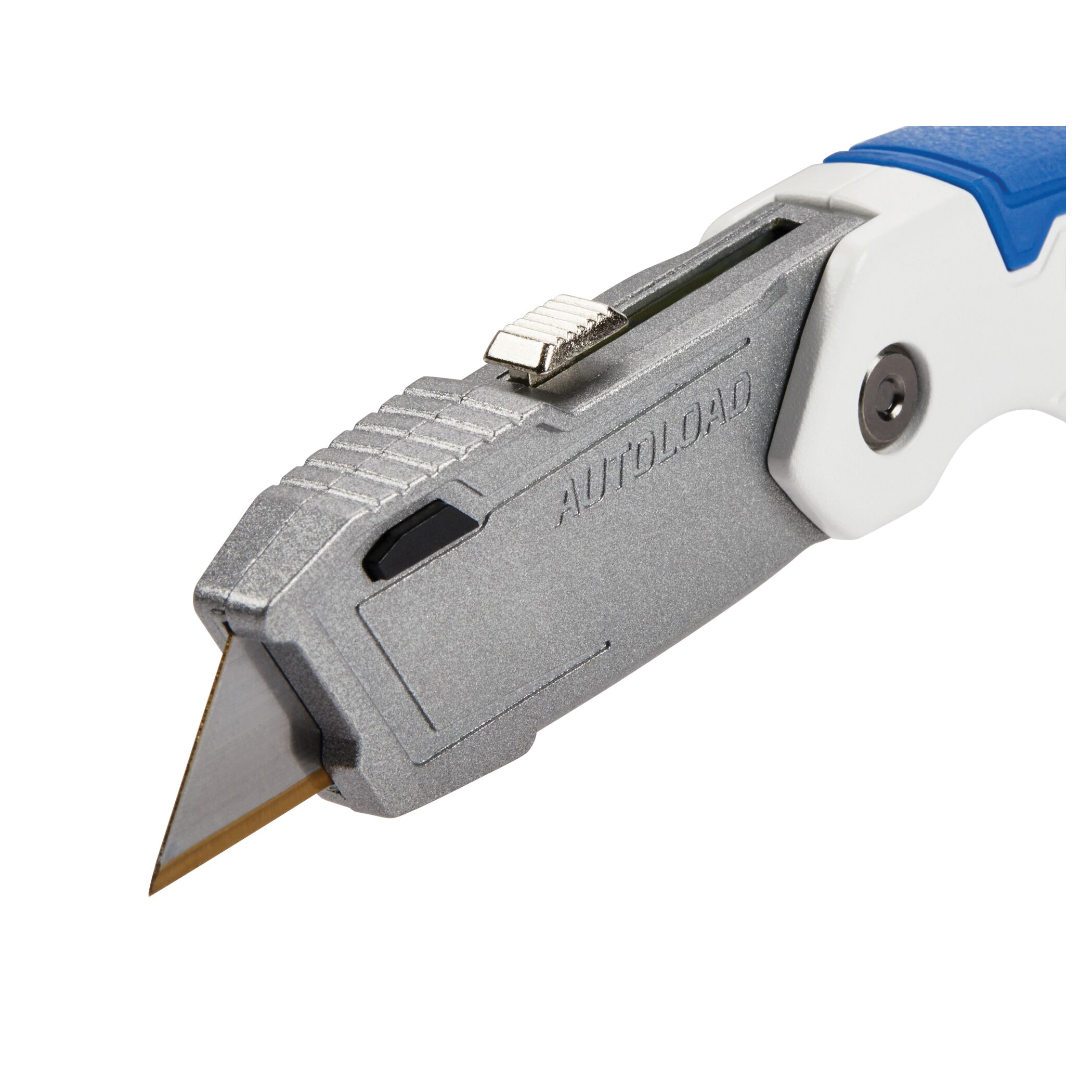 - Blade Change Method:Push ButtonBlade Length:2-3/8 inBlade Material:SteelBlade Type:Auto-LoadHandle Material:AluminumHandle Size:4 inHandle Type:Comfort GripNumber of Blades Included:3Overall Length:8.6 inOverall Width:3-1/2 inType:Folding Retractable