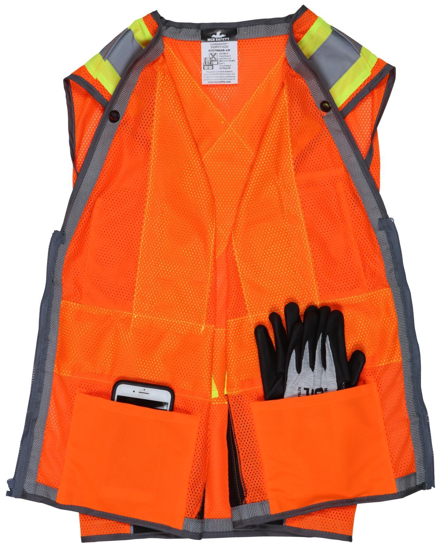 MCR Safety SURVCS2OX2 Luminator Surveyor Style Safety Vest, 2X, Fluorescent Orange, Polyester, Zipper Front Closure, 6 Pockets, ANSI Class: Class 2, ANSI/ISEA 107-2020 Type R