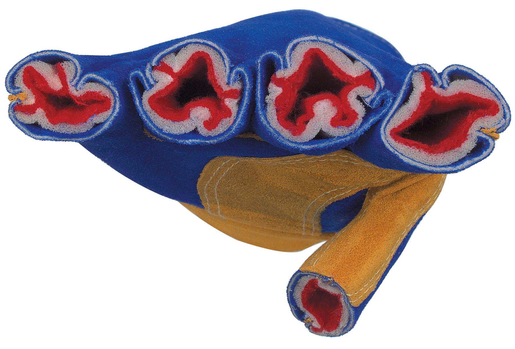 - Color:BlueCuff Style:GauntletGlove Material Thickness:1.1 to 1.6 mmLength:13 inLining:FoamMaterial:Split Select Shoulder Cow Skin LeatherPalm Material:Cowhide LeatherSeries:Memphis Welding 4500Size:LStyle:Wing ThumbType:Premium Grade