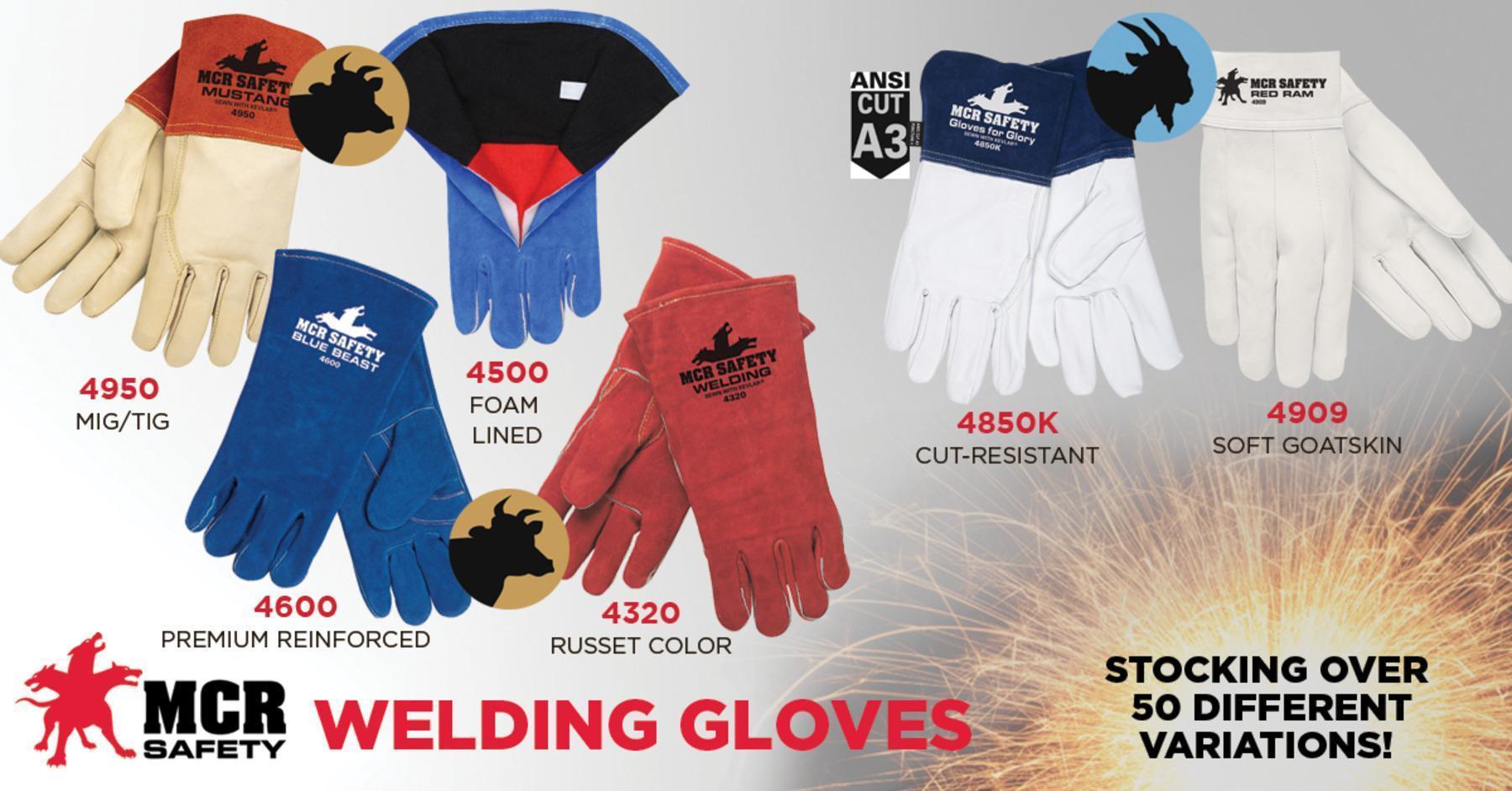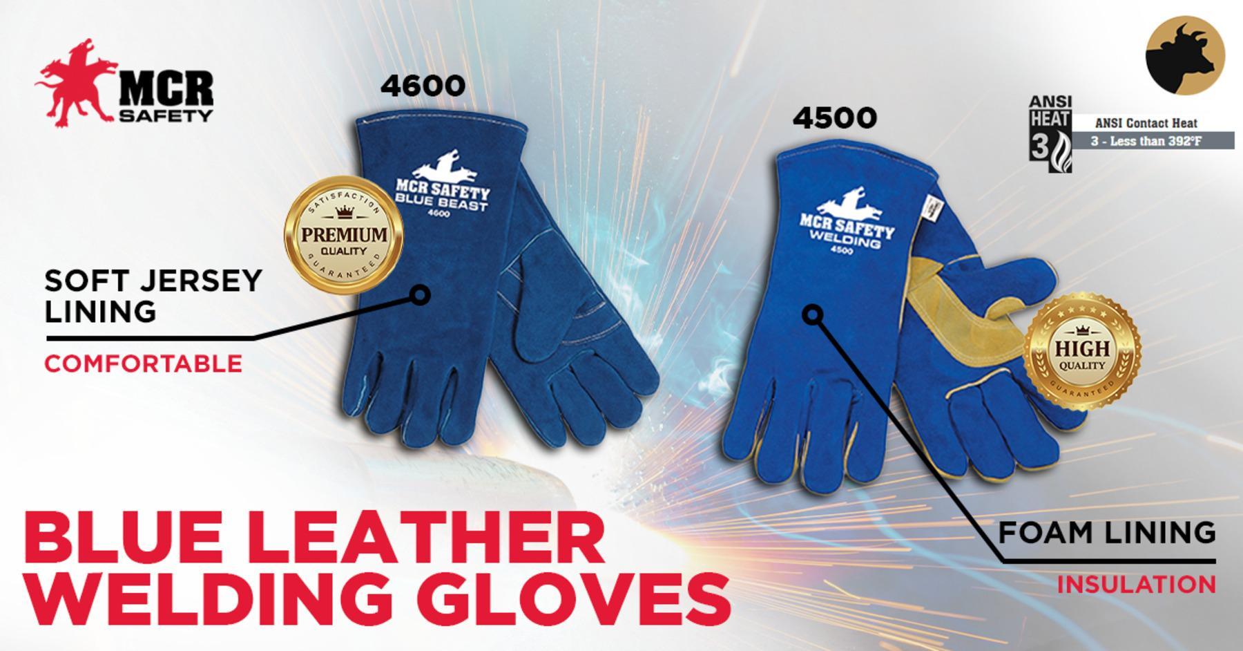 MCR Safety 4500L MCR Safety Welding 4500 Premium Grade Welding Gloves, L, Split Select Shoulder Cow Skin Leather, Blue, Foam Lining, Gauntlet Cuff, 13 in L, 1.1 to 1.6 mm THK Glove Material