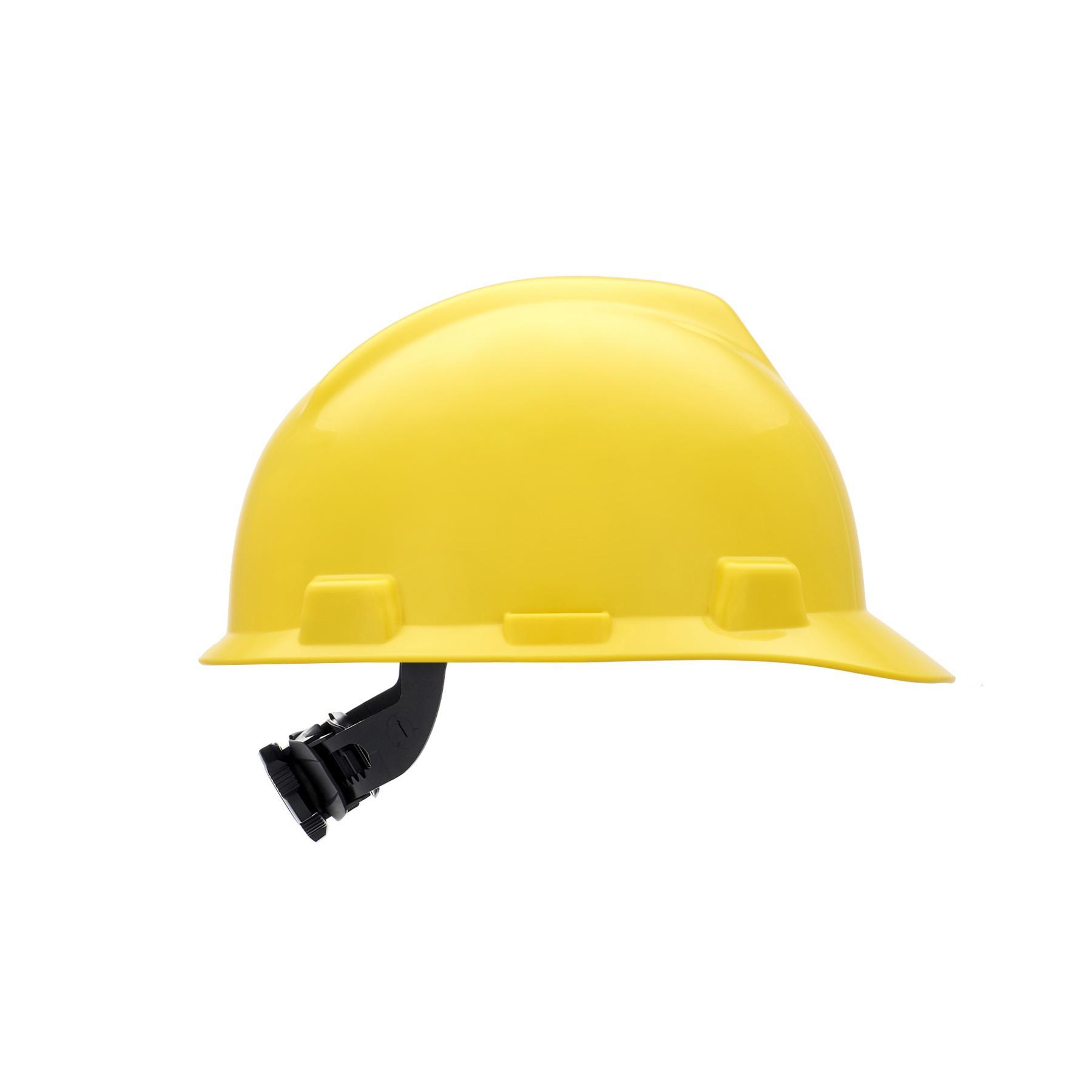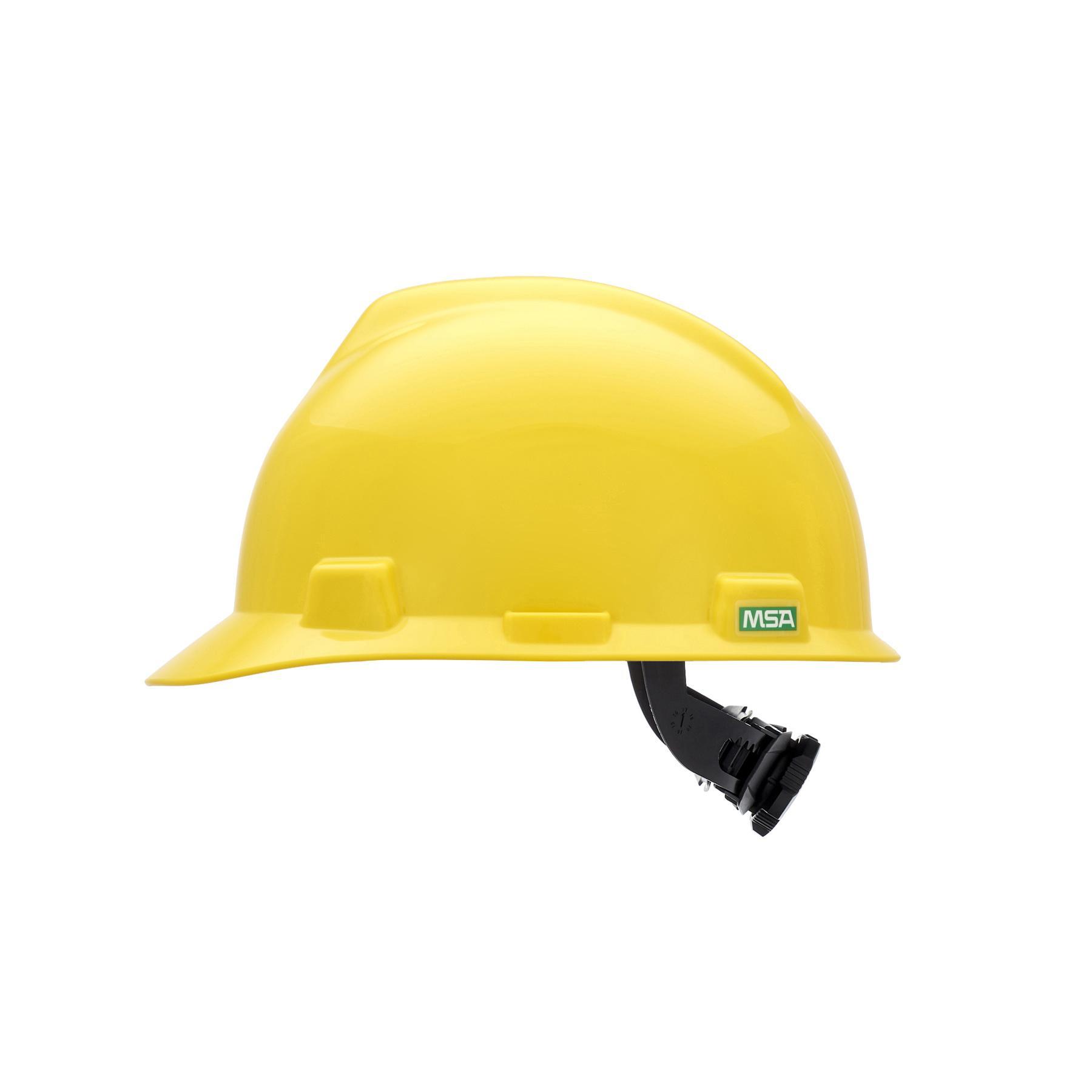MSA V-Gard 477479 Front Brim Hard Hat, 6-1/2 Fits Mini Hat, 8 Fits Max Hat, Polyethylene, 4-Point Suspension, ANSI Electrical Class Rating: Class E and G, ANSI Impact Rating: Type I, Ratchet Adjustment