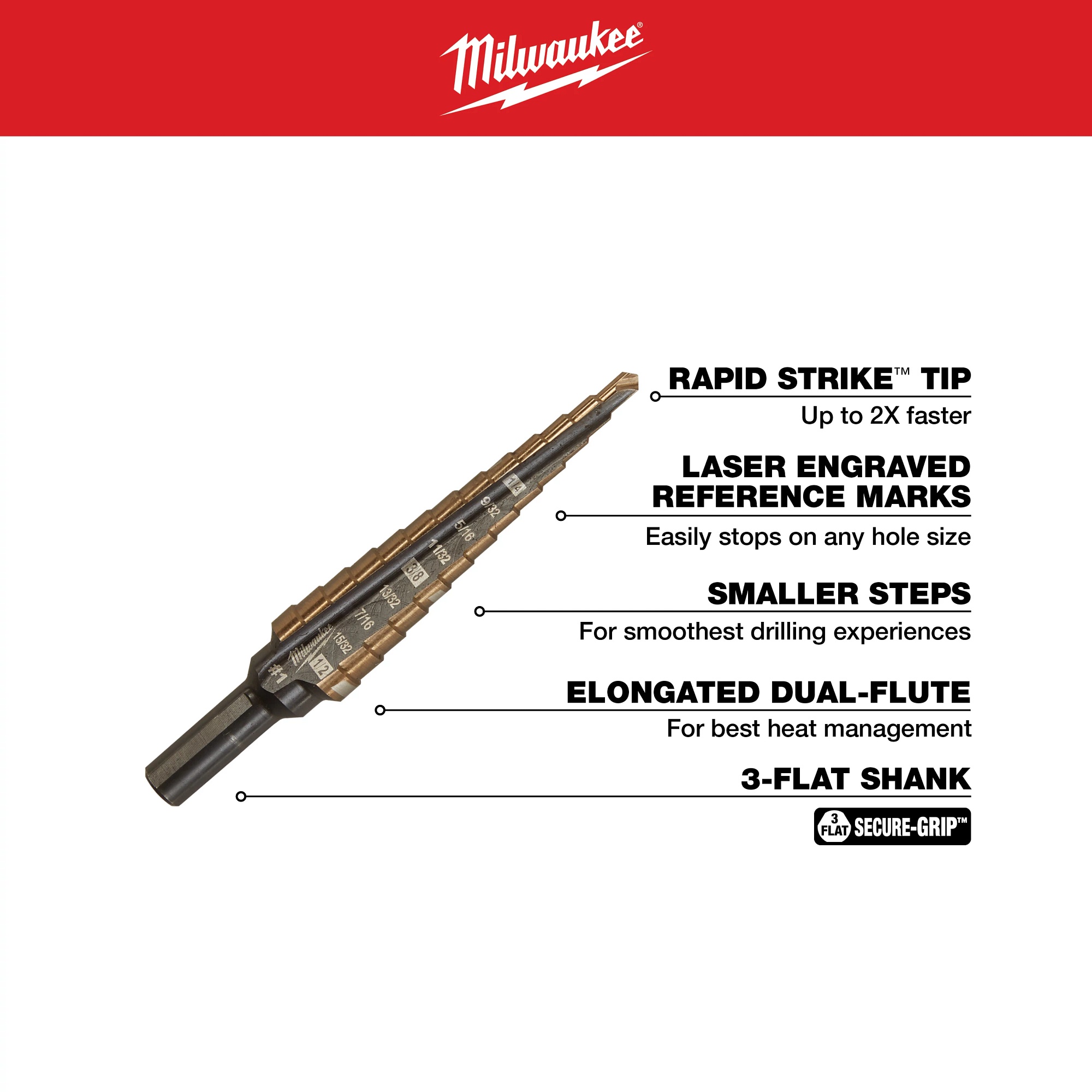 Milwaukee 48-89-9281 Single Ended Step Drill Bit, 1/8 in Dia Min Hole, 1/2 in Dia Max Hole, Bi-Metal, 3/8 in Shank