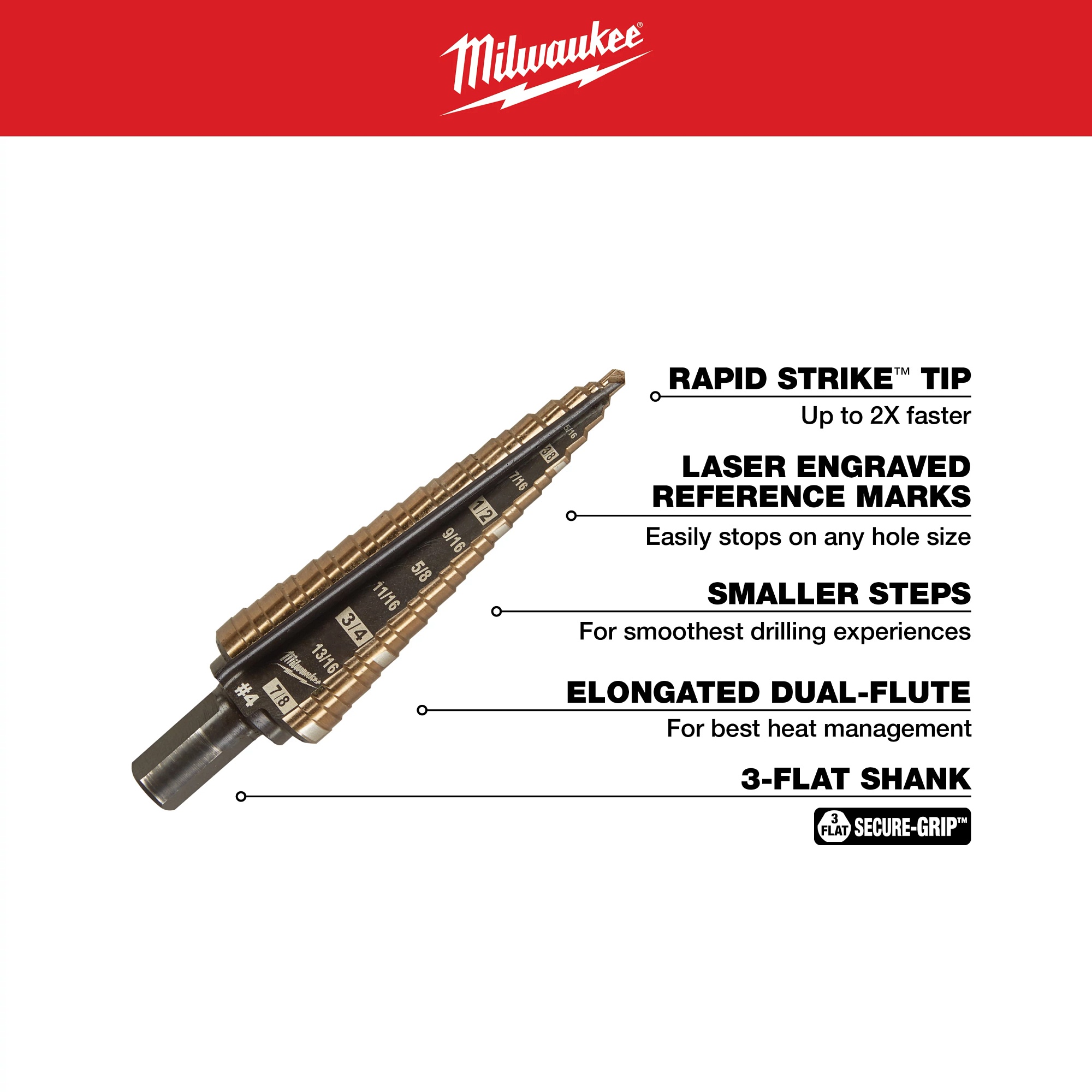 Milwaukee 48-89-9284 Single Ended Step Drill Bit, 3/16 in Dia Min Hole, 7/8 in Dia Max Hole, Bi-Metal, 3/8 in Shank