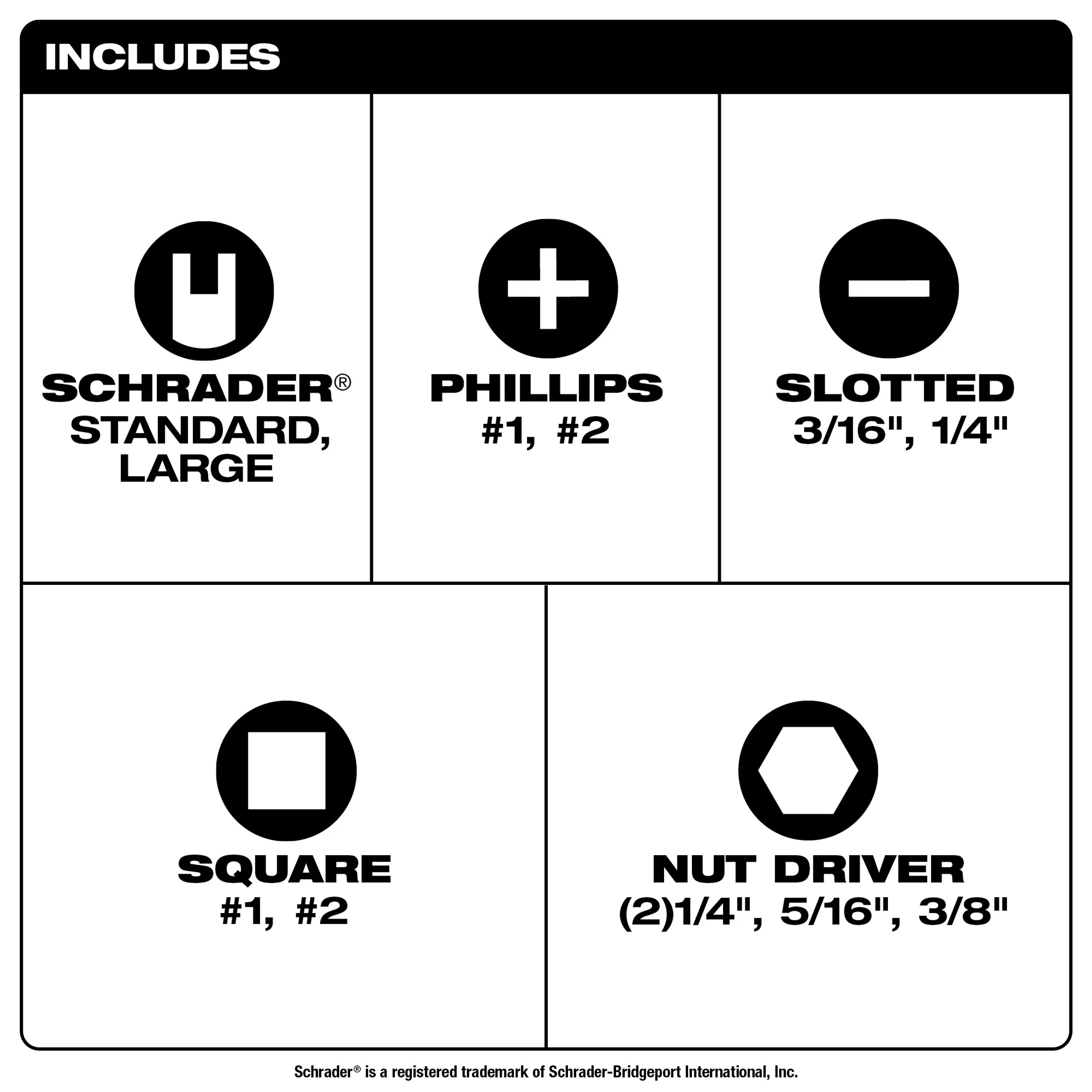 - 4 unique nut drivers 1/4 in, 5/16 in, 3/8 in, 1/2 in