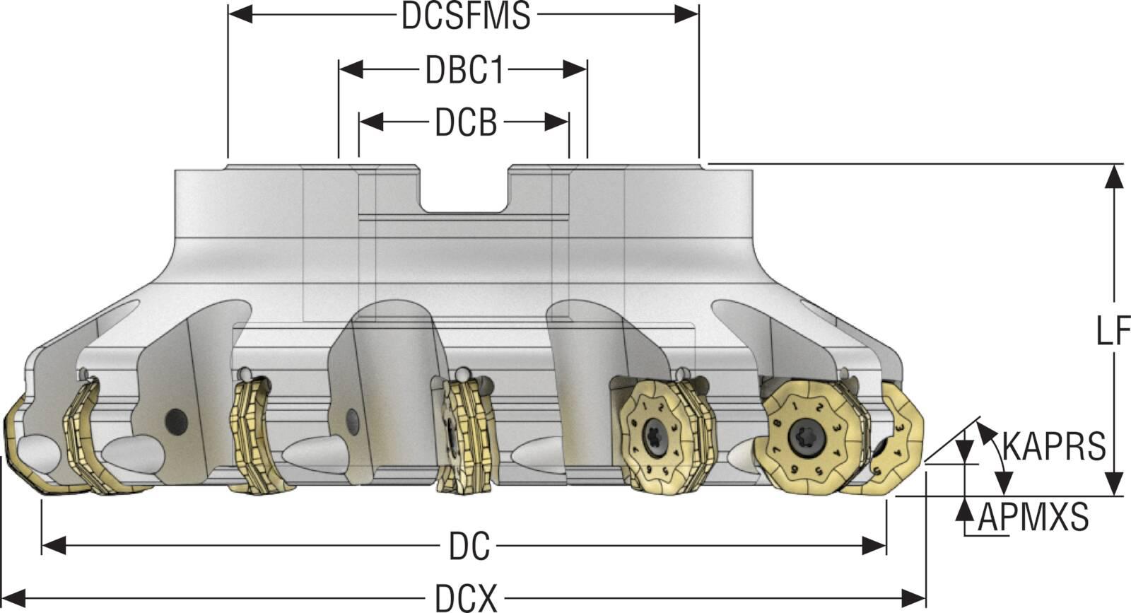 Seco 02685849 R220.48 Indexable Chamfer & Angle Face Mill, 6.299 in Dia Cutting, 2.48 in OAL, 0.236 in Max Depth of Cut, 1.575 in Dia Arbor Hole, 40| deg Lead Angle