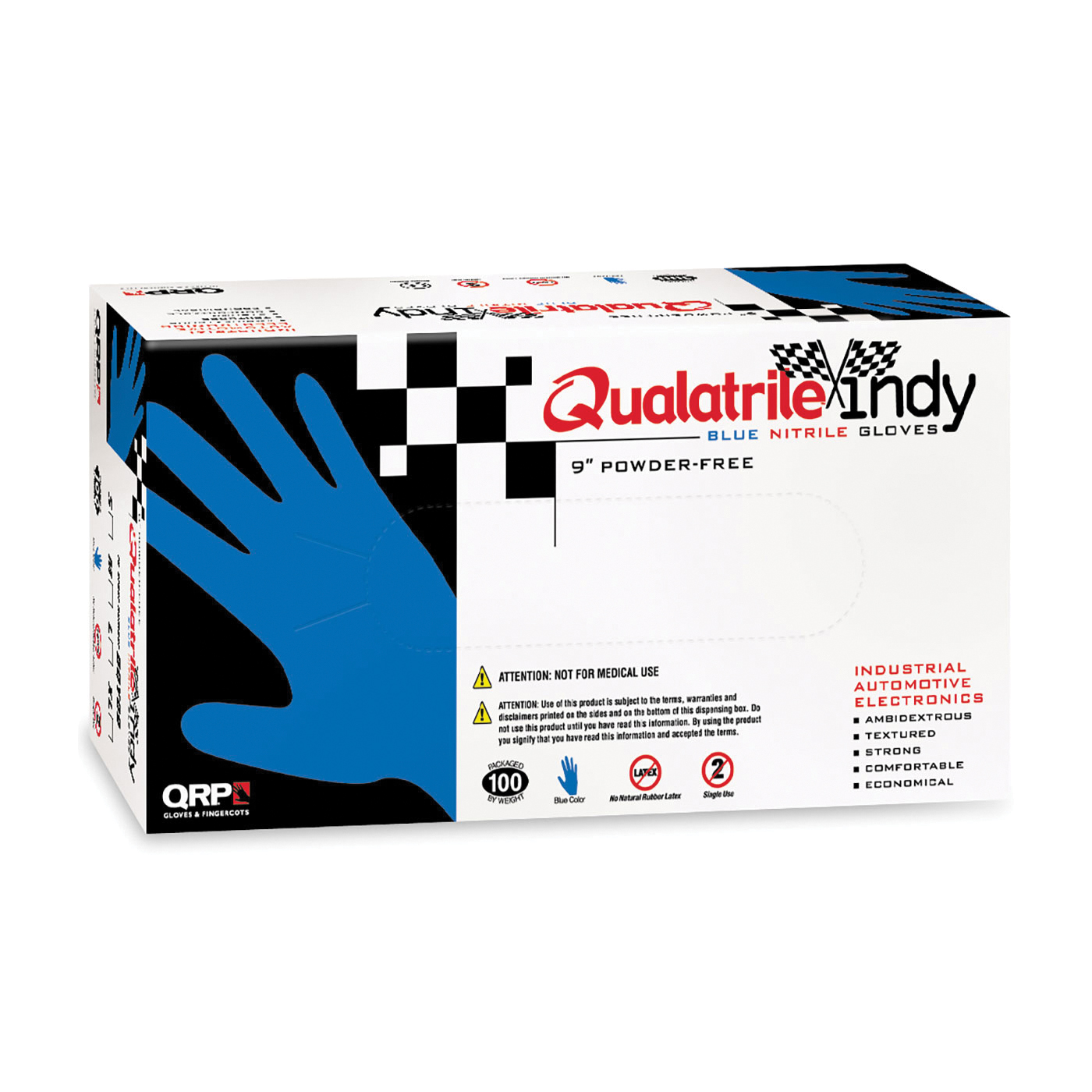 QRP Qualatrile Indy BQY09-2X Single-Use Disposable Gloves 2XL Acrylonitrile Butadiene Rubber/Natural Rubber Latex/Nitrile/Vinyl Blue 9 in L Powder-Free Micro-Textured 4 mil THK Application Type: Industrial Grade Ambidextrous Hand