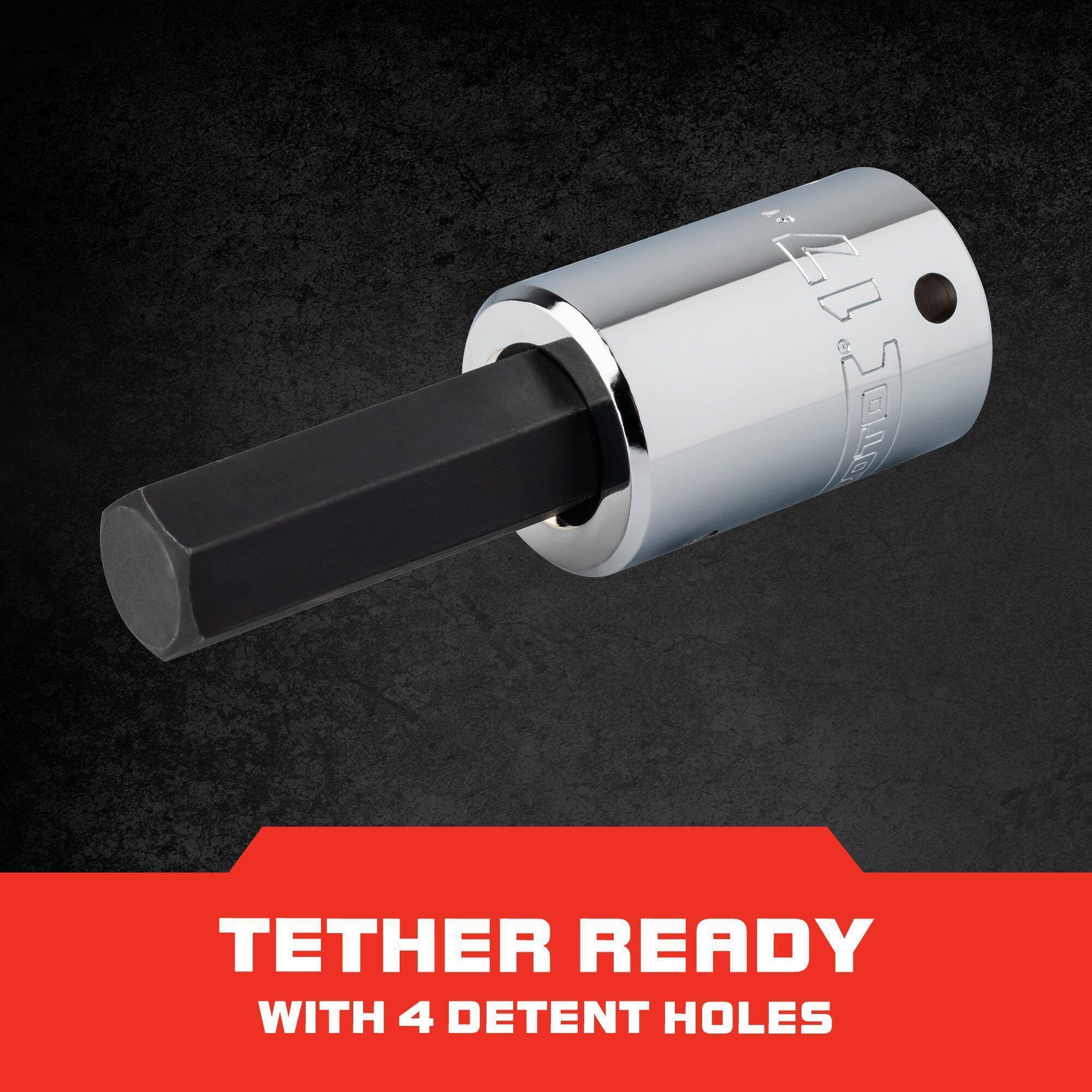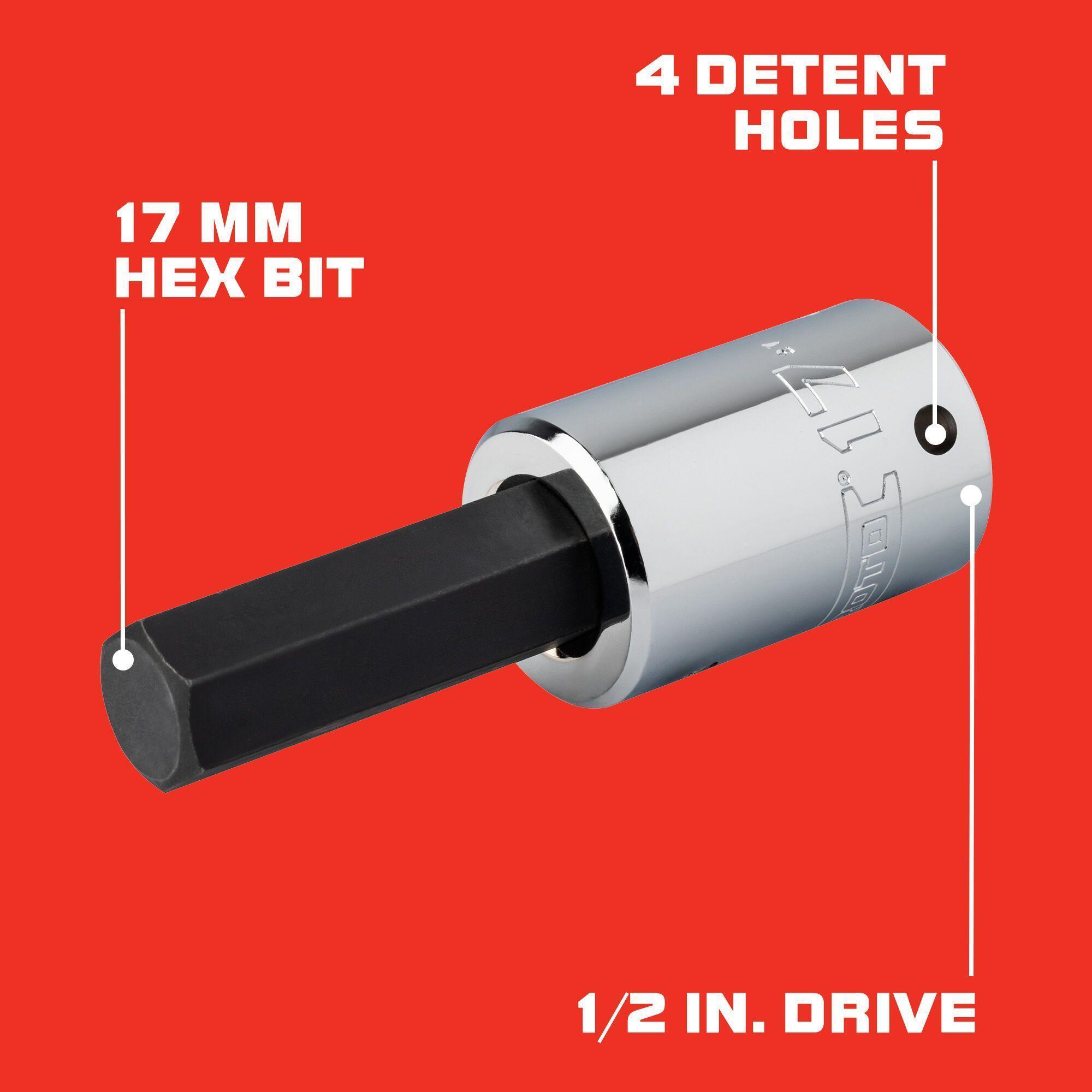 - Bit Length:2 inBit Size:17 mmBit Type:HexDrive Size:1/2 inFinish:Polished ChromeMaterial:Heat Treated Alloy SteelMeasurement System:MetricOverall Length:4 inTether Capable:YesType:Standard Length