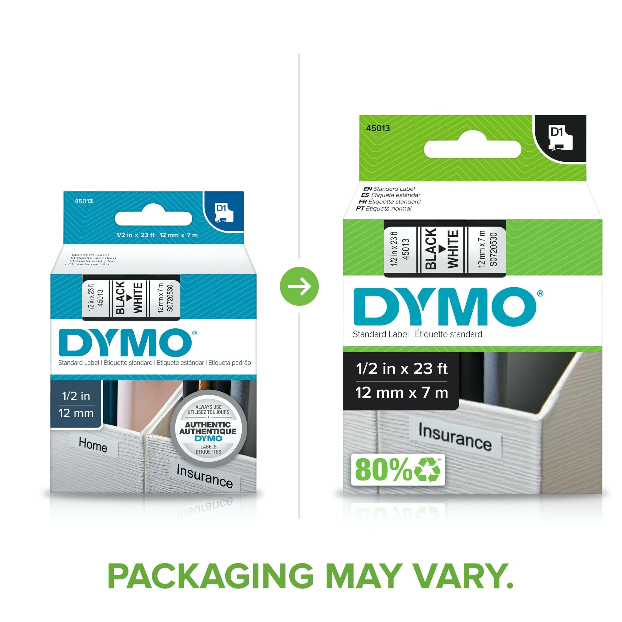 DYMO®, 45013, Electrical Label Tape, 23 ft Length, 0.5 in Width, 7 mm Height, Black/White Legend/Background