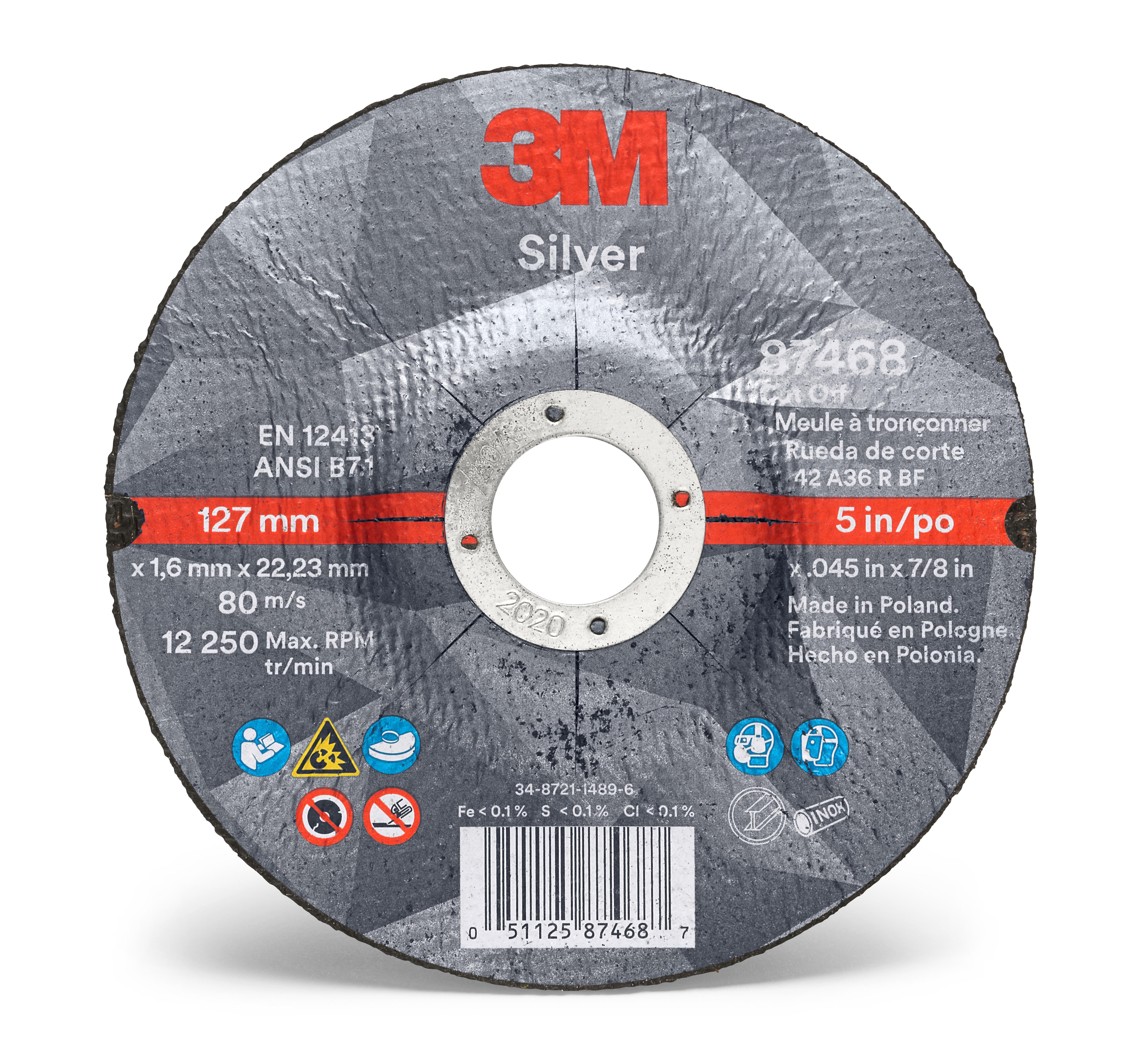 - Country of Origin:PLIn Stock:YesManufacturer Name:3MAbrasive Material:Ceramic Grain, Precision Shaped CeramicApplicable Materials:All Metal, Aluminum, Carbon Steel, Cast Iron, Soft Metal and Stainless Steel, Carbon SteelBond Type:ResinCenter Hole Size:0.875 in, 7/8 inConnector Type:ArborGrit:36+Maximum Speed:12250 rpmReinforced:YesSeries:87468Specifications Met:ANSI B7.1Type:Type 27Wheel Color:BlackWheel Diameter:5 inWheel Thickness:0.045 inWheel Type Number:T27, Type 27