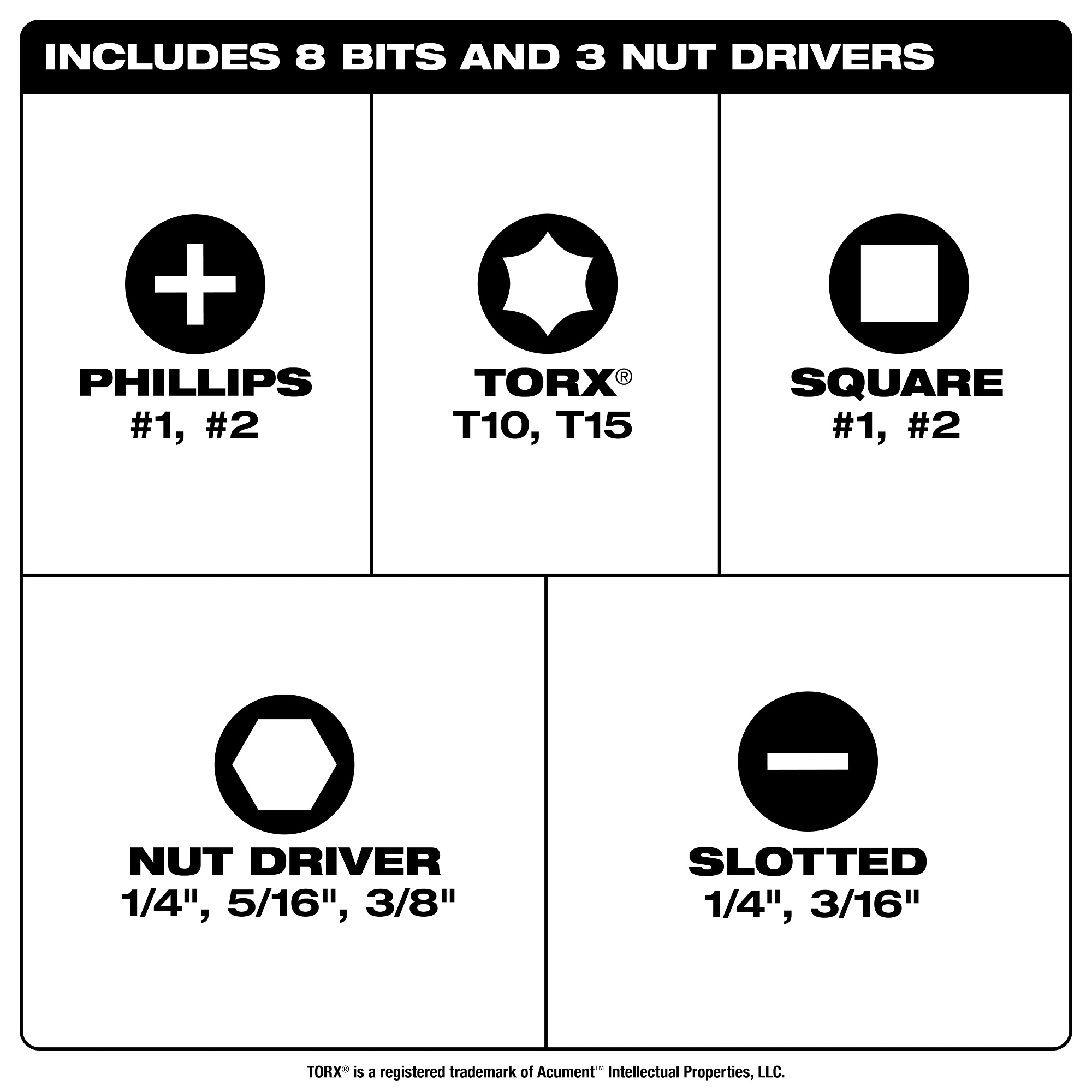 - Country of Origin:CNManufacturer Name:Milwaukee ToolBit Retainer Type:MagneticBit Type:Phillips/Slotted/Square/Torx/Nut DriverDrive Type:Multi-BitHandle Type:Tri-Lobe GripMagnetized Tip:YesMaterial:SteelNumber of Pieces:11Overall Length:8 inType:11-in-1