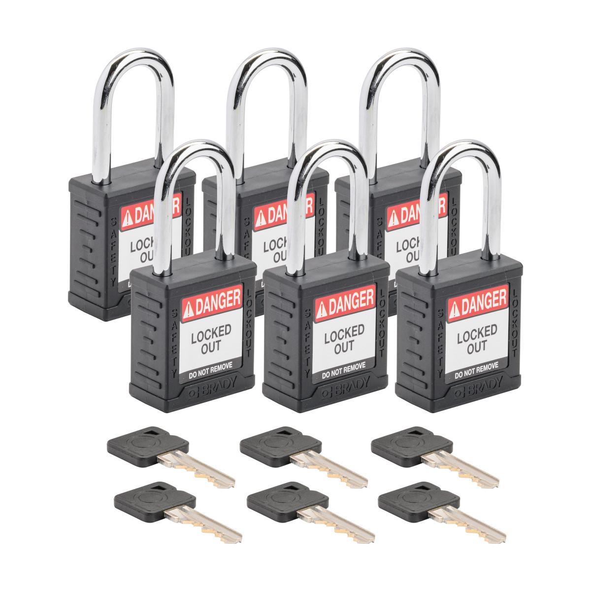 Brady SDPL-BLK-38ST-KA6 Lockout Padlock, Alike Key, Black, Nylon Body, 0.25 in Dia 1.5 in H 1 in W Steel Shackle, 0.82 in L Body, Conductive Conductivity
