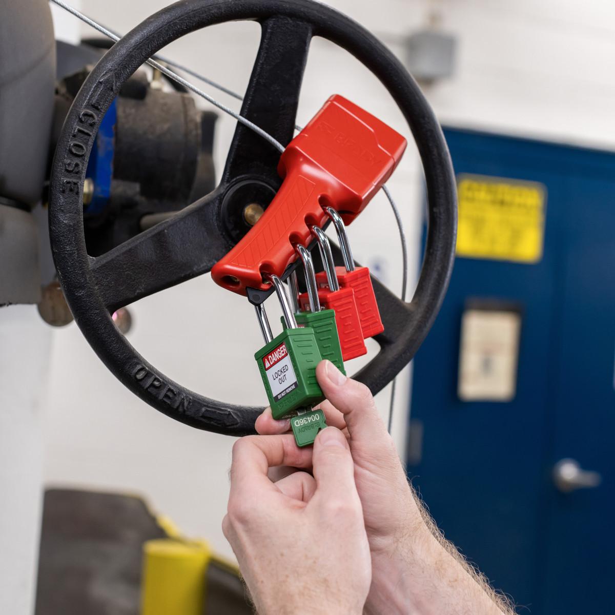- Manufacturer Name:Brady WorldwideBody Length:0.82 inBody Material:NylonBody Width:1.5 inColor:BlackConductivity:ConductiveKey Type:AlikeLegend:DANGER LOCKED OUT DO NOT REMOVE, PROPERTY OFLocking Mechanism:6-PinShackle Diameter:0.25 inShackle Height:1.5 inShackle Material:SteelShackle Width:1 in