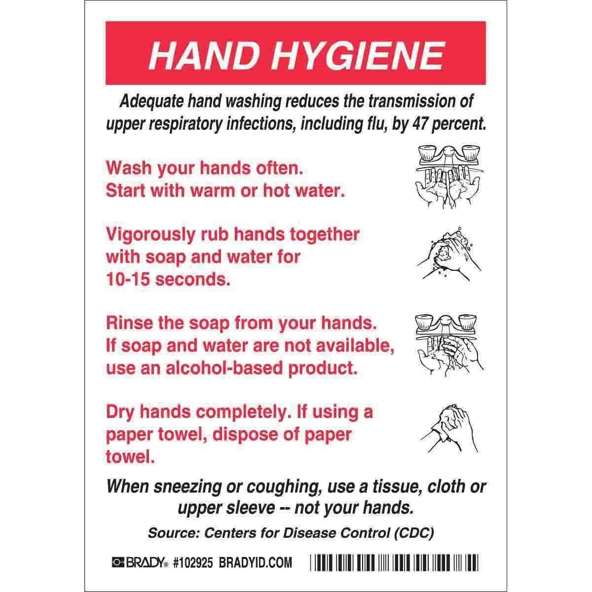 - Height:7 inLanguage:EnglishLegend:HAND HYGIENELegend Style:Symbol/TextLegend/Background Color:Black/Red on WhiteMaterial:B-946 VinylMounting Type:Adhesive, Self-AdhesiveType:DiamondWidth:5 in
