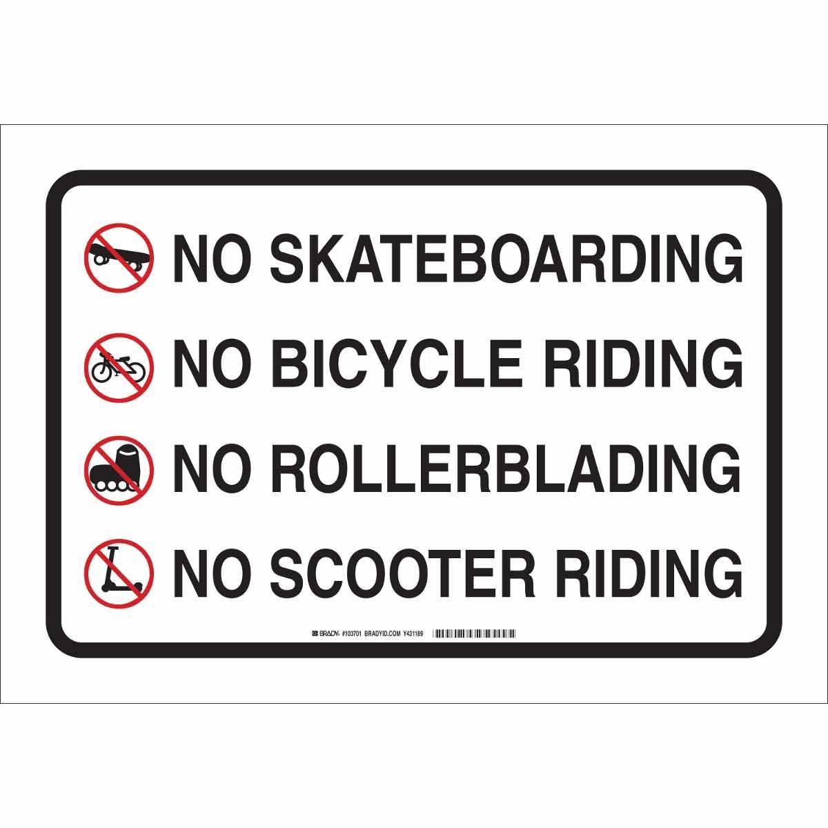 - Height:14 inLegend:NO SKATEBOARDING NO BICYCLE RIDING NO ROLLERBLADING NO SCOOTER RIDINGLegend Style:Symbol/TextLegend/Background Color:Black/Red on WhiteMaterial:B-959 AluminumMounting Type:Fastened, SurfaceType:RectangularWidth:20 in