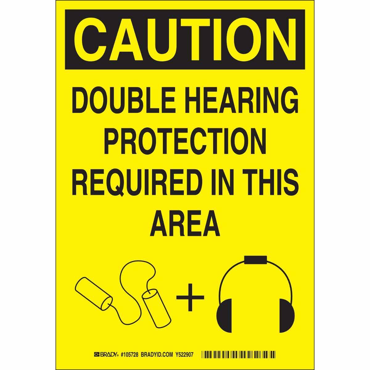 - Header:CAUTIONHeight:10 inLegend:CAUTION DOUBLE HEARING PROTECTION REQUIRED IN THIS AREA, DOUBLE HEARING PROTECTION REQUIRED IN THIS AREALegend Style:Symbol/TextLegend/Background Color:Black on YellowMaterial:B-120 FiberglassMounting Type:Corner Hole, Corner Holes, FastenedType:RectangularWidth:7 in
