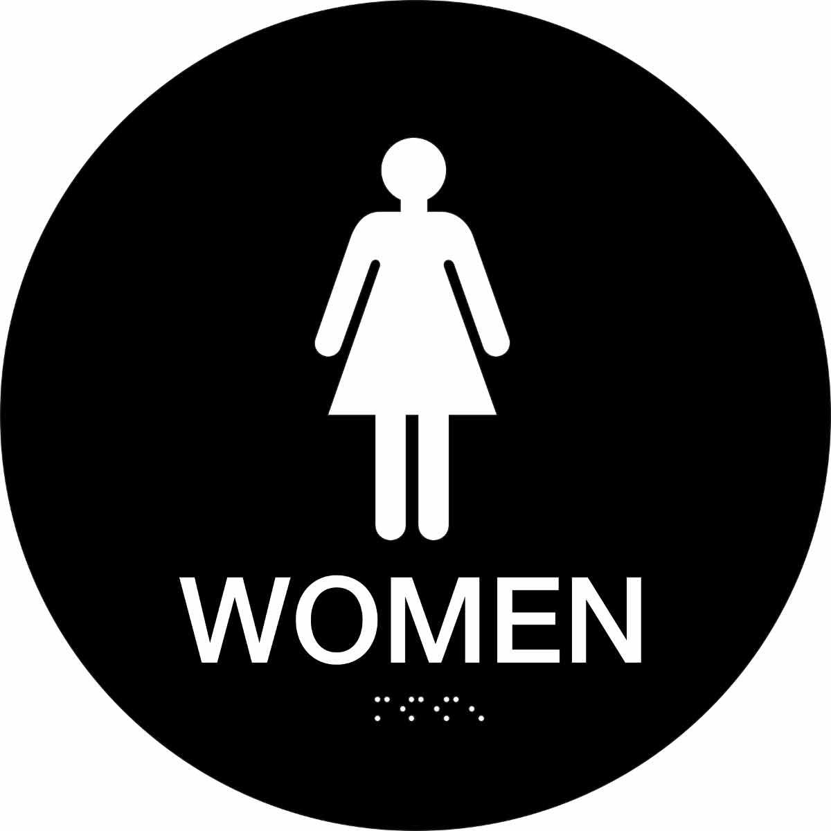 - Language:Braille/EnglishLegend:WOMENLegend Style:Symbol/TextLegend/Background Color:White on BlackMaterial:PlasticMounting Type:Foam AdhesiveType:CircularWidth:12 in