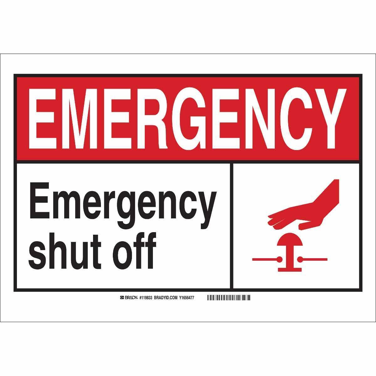 Brady 119837 Rectangular Emergency and Safety Sign, 10 in H x 14 in W, Black/Red/White, B-401 Polystyrene, Fastened Mount