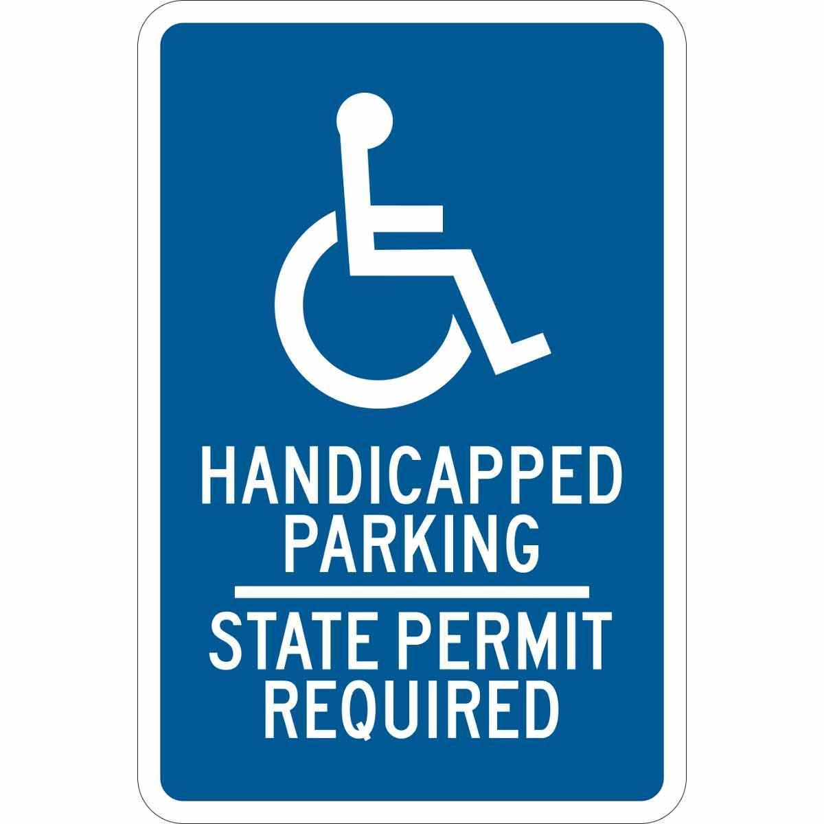 - Height:18 inLegend:HANDICAPPED PARKING STATE PERMIT REQUIREDLegend Style:Symbol/TextLegend/Background Color:White on BlueMaterial:B-555 AluminumMounting Type:FastenedType:RectangularWidth:12 in
