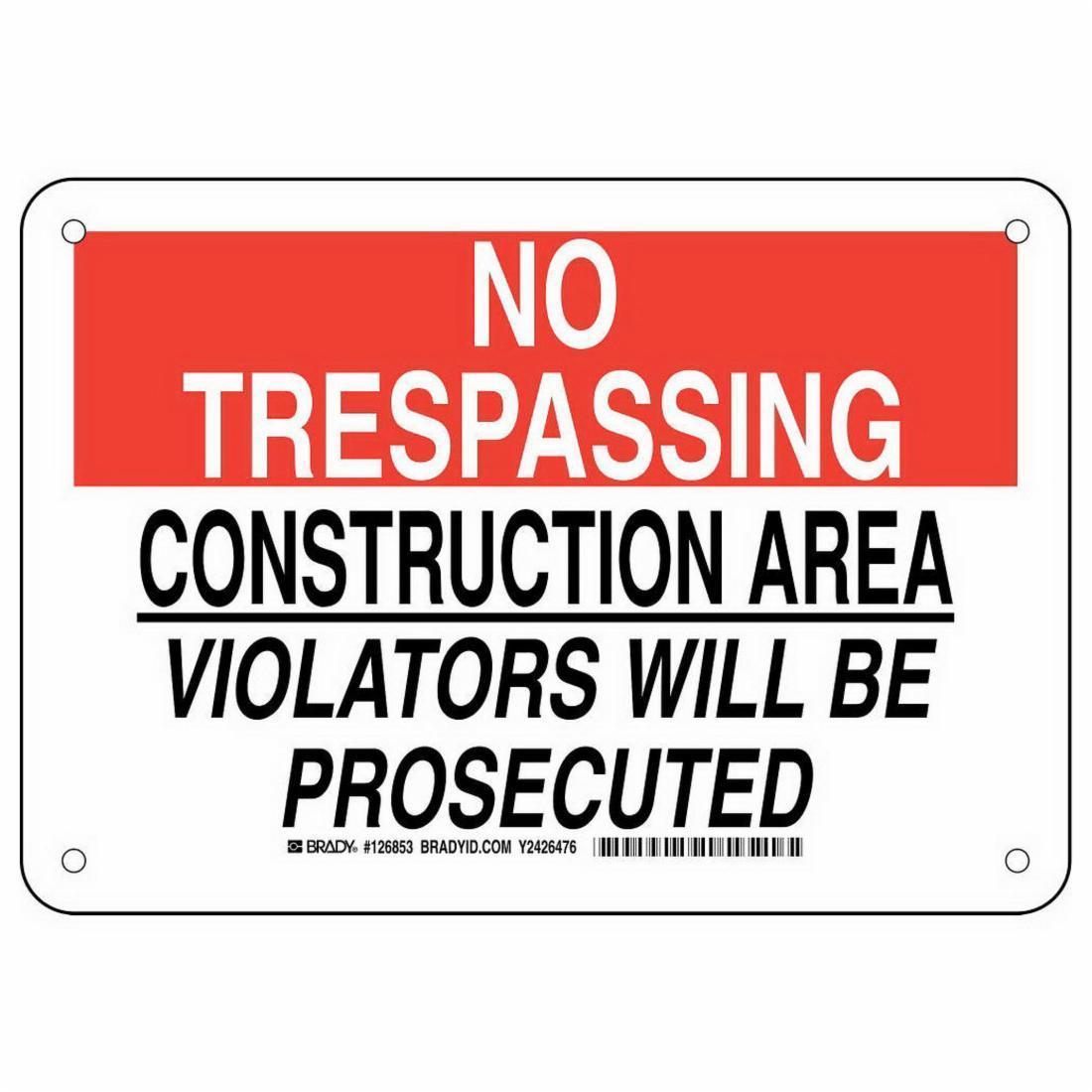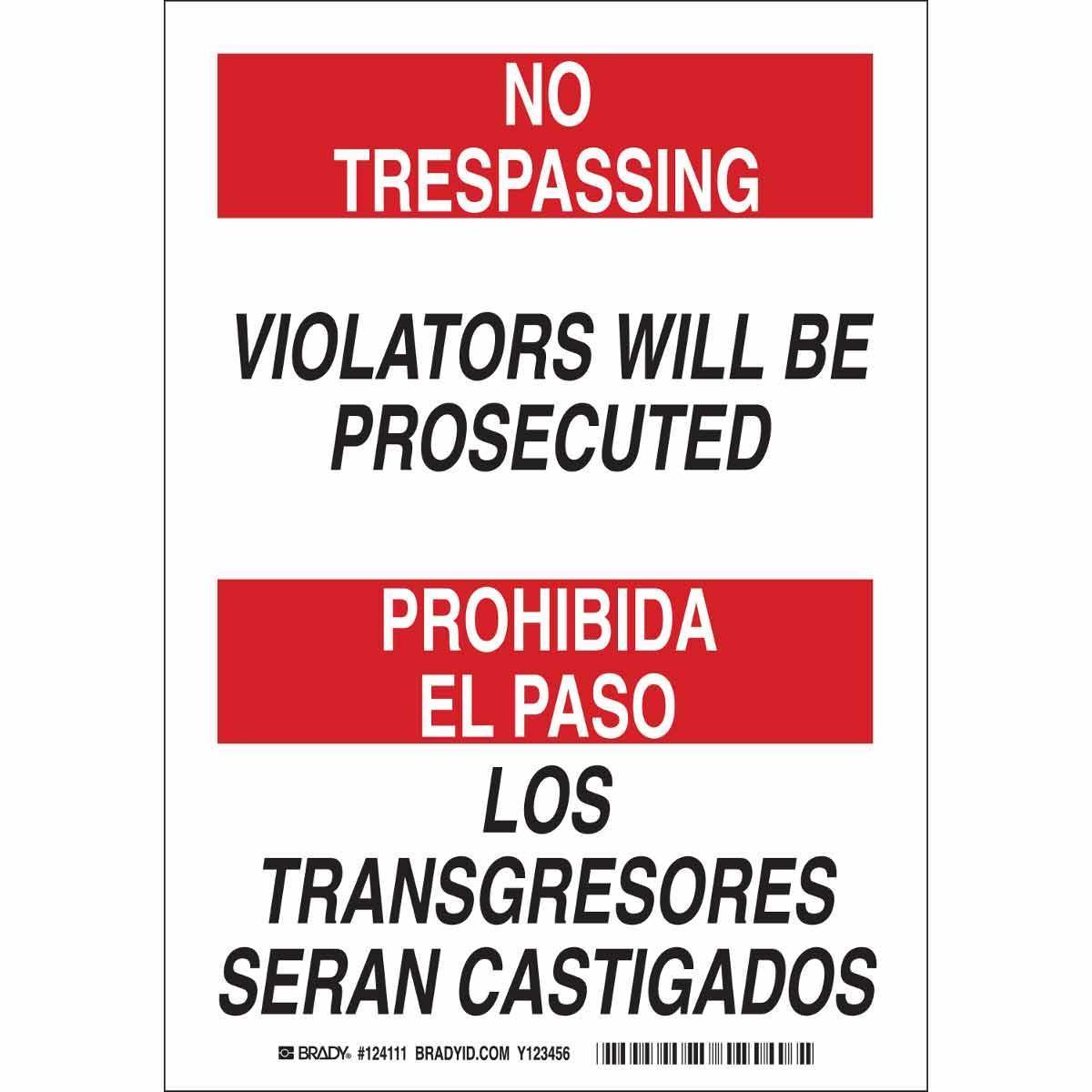 - Height:14 inLegend:NO TRESPASSING/PROHIBIDA EL PASO VIOLATORS WILL BE PROSECUTED/LOS TRANSGRESORES SERAN CASTIGADOSLegend Style:TextLegend/Background Color:Black/Red on WhiteMaterial:B-555 AluminumMounting Type:FastenedType:RectangularWidth:10 in
