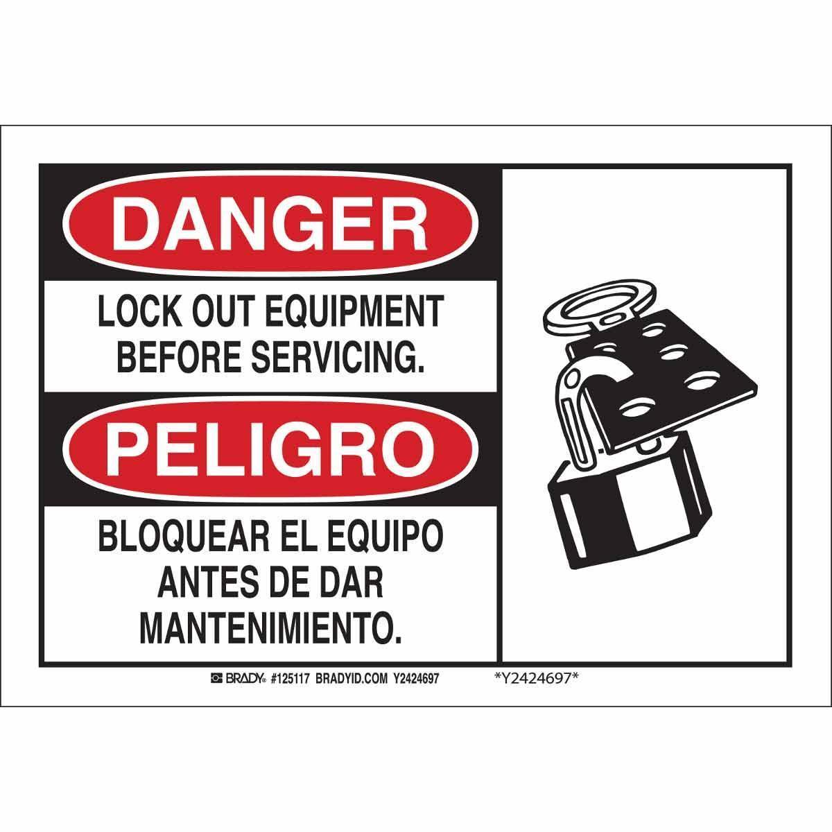 Brady 125118 Rectangular Lockout Tagout Sign, DANGER/PELIGRO, 10 in H x 14 in W, Black/Red on White, B-555 Aluminum, Fastened Mount