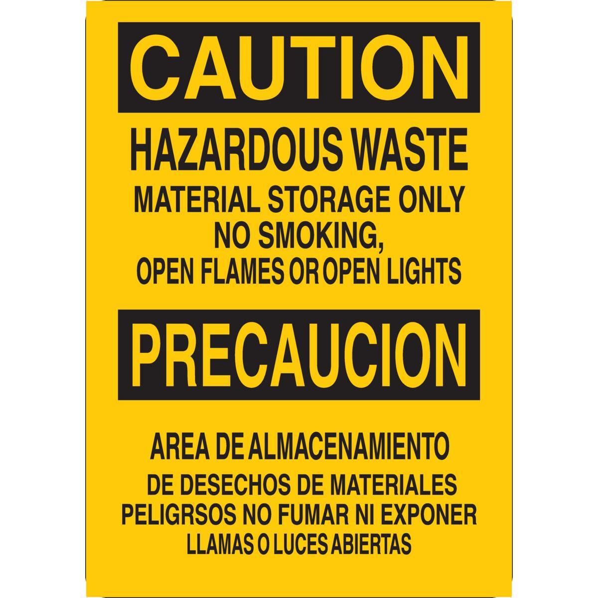 - Header:CAUTION/PRECAUCIONHeight:14 inLanguage:English/SpanishLegend:HAZARDOUS WASTE MATERIAL STORAGE ONLY NO SMOKING, OPEN FLAMES OR OPEN LIGHTS/AREA DE ALMACENAMIENTO DE DESECHOS DE MATERIALES PELIGROSOS. NO FUMAR NI EXPONER LLAMAS O LUCES ABIERTAS.Legend Style:TextLegend/Background Color:Black on YellowMaterial:B-401 PolystyreneMounting Type:FastenedType:Bilingual RectangleWidth:10 in