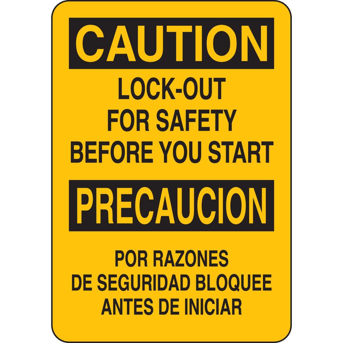 Brady 125409 Rectangular Lockout Tagout Sign, CAUTION/PRECAUCION, 10 in H x 7 in W, Black on Yellow, B-555 Aluminum, Fastened Mount