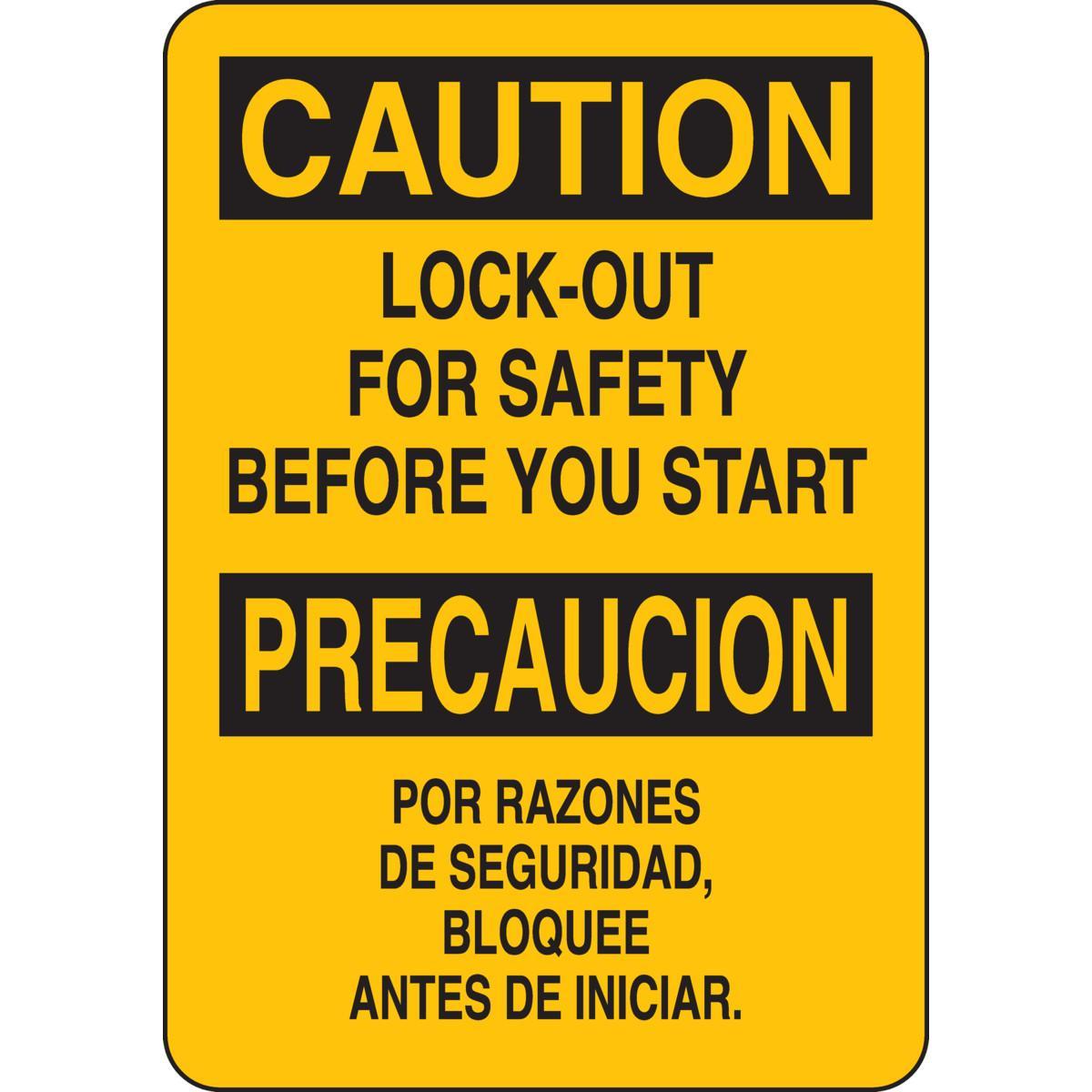 - Header:CAUTION/PRECAUCIONHeight:10 inLegend:LOCK-OUT FOR SAFETY BEFORE YOU START/POR RAZONES DE SEGURIDAD, BLOQUEE ANTES DE INICIARLegend Style:TextLegend/Background Color:Black on YellowMaterial:B-302 PolyesterMounting Type:AdhesiveType:Laminated RectangularWidth:7 in