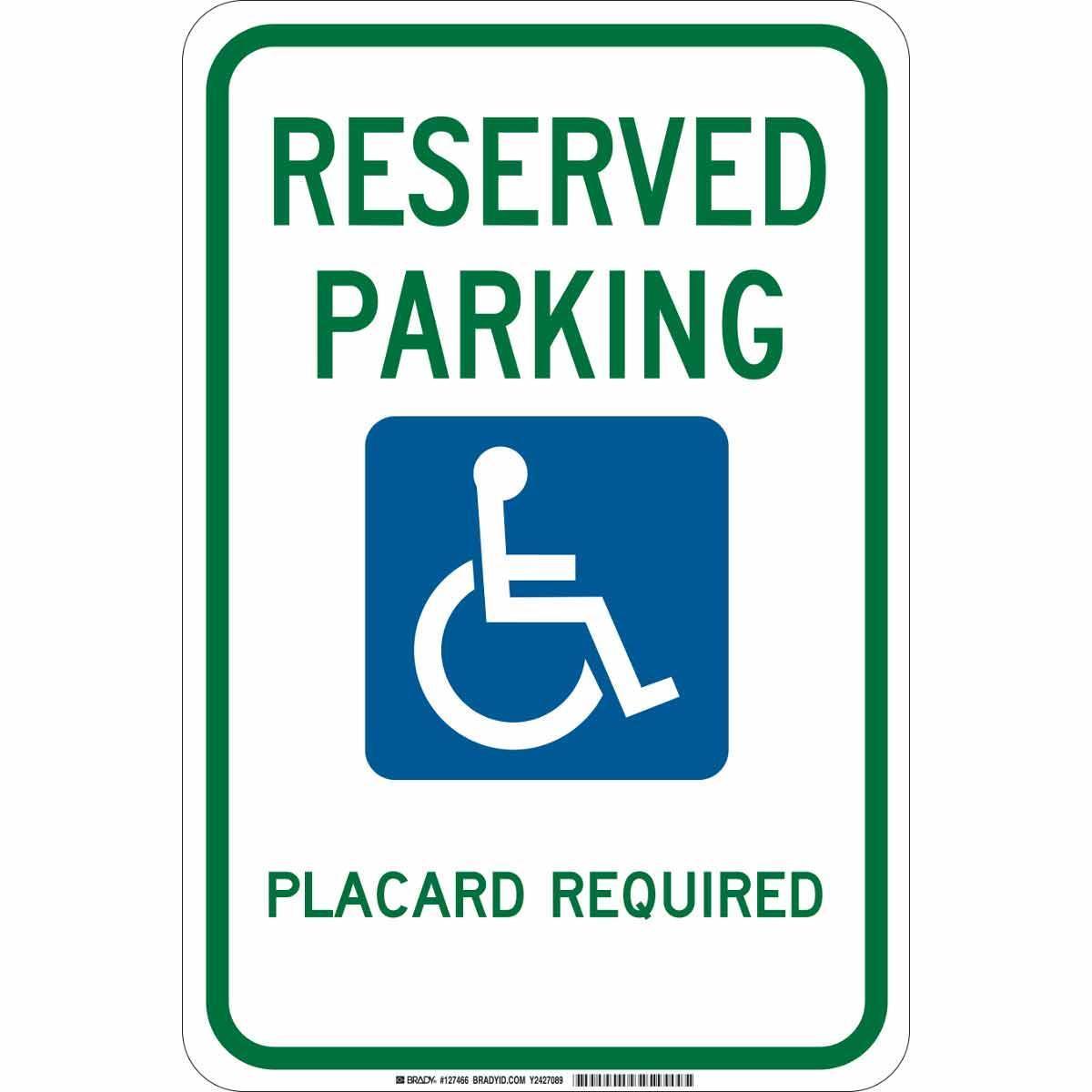 - Height:18 inLegend:RESERVED PARKING PLACARD REQUIREDLegend Style:Symbol/TextLegend/Background Color:Blue/Green on WhiteMaterial:B-302 PolyesterMounting Type:AdhesiveType:Laminated RectangularWidth:12 in