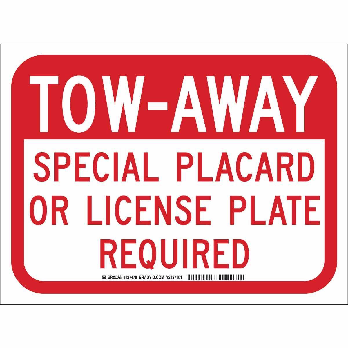 - Height:9 inLegend:TOW-AWAY SPECIAL PLACARD OR LICENSE PLATE REQUIREDLegend Style:TextLegend/Background Color:Red on WhiteMaterial:B-555 AluminumMounting Type:FastenedType:RectangularWidth:12 in