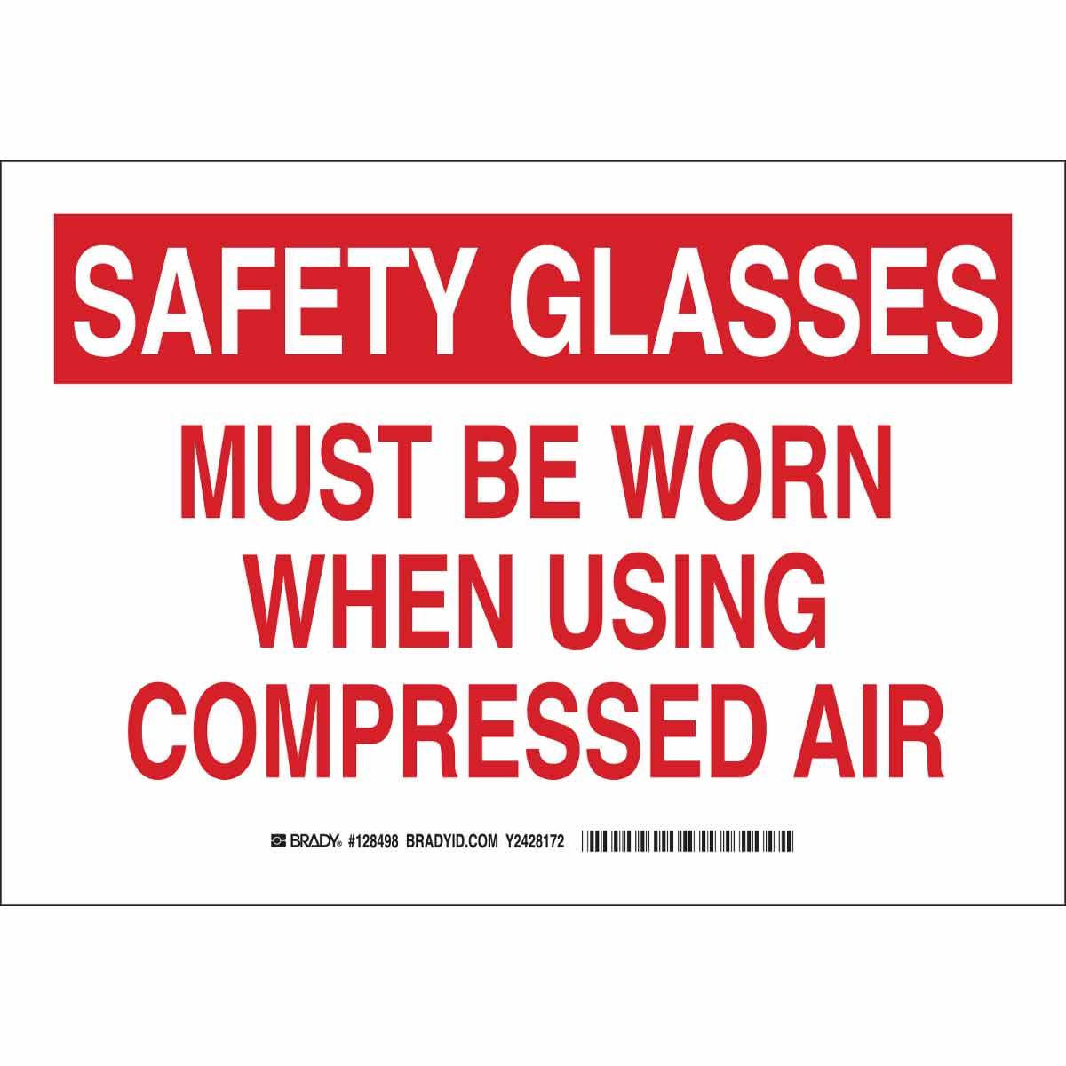 Brady 128500 Rectangular Personal Protection (PPE) Sign, SAFETY GLASSES, 10 in H x 14 in W, Red on White, B-401 Polystyrene, Fastened Mount