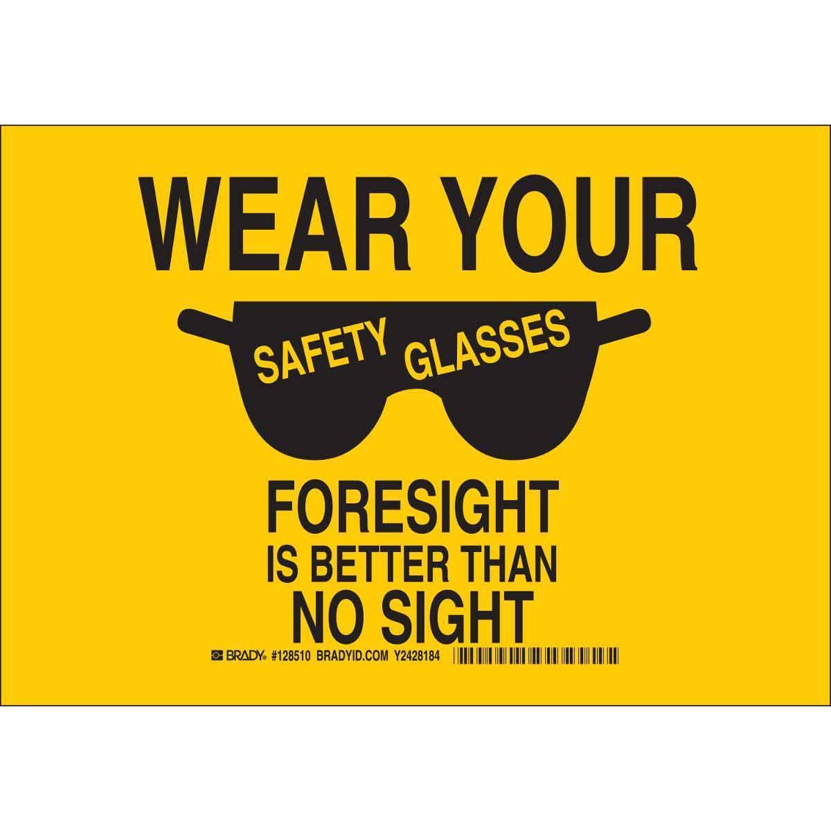 - Height:7 inLegend:WEAR YOUR SAFETY GLASSES FORESIGHT IS BETTER THAN NO SIGHTLegend Style:Symbol/TextLegend/Background Color:Black on YellowMaterial:B-555 AluminumMounting Type:FastenedType:RectangularWidth:10 in