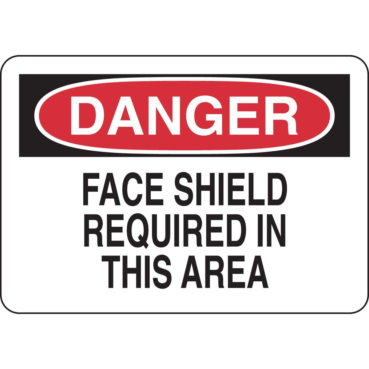 - Header:DANGERHeight:10 inLegend:FACE SHIELD REQUIRED IN THIS AREALegend Style:TextLegend/Background Color:Black/Red on WhiteMaterial:B-555 AluminumMounting Type:FastenedType:RectangularWidth:14 in