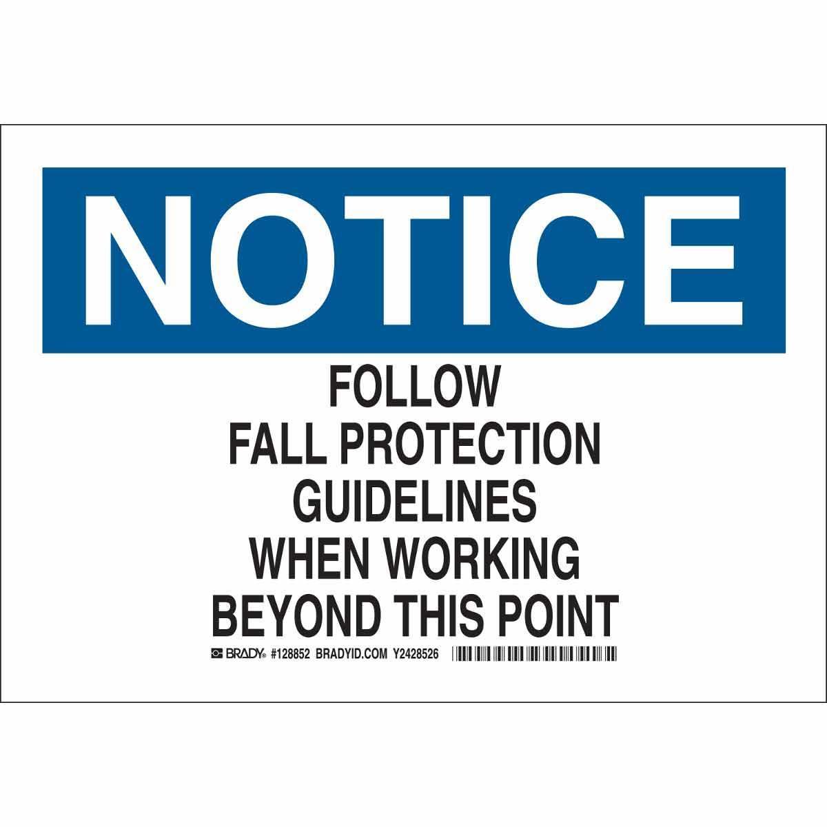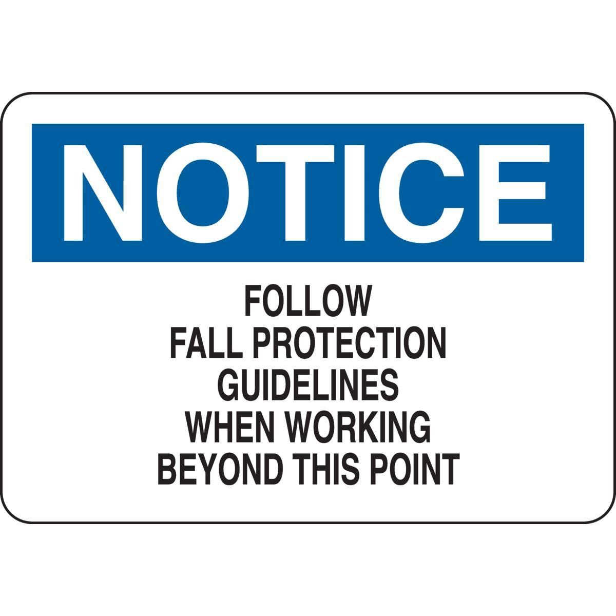 - Header:NOTICEHeight:7 inLegend:FOLLOW FALL PROTECTION GUIDELINES WHEN WORKING BEYOND THIS POINTLegend Style:TextLegend/Background Color:Black/Blue on WhiteMaterial:B-401 PolystyreneMounting Type:FastenedType:RectangularWidth:10 in