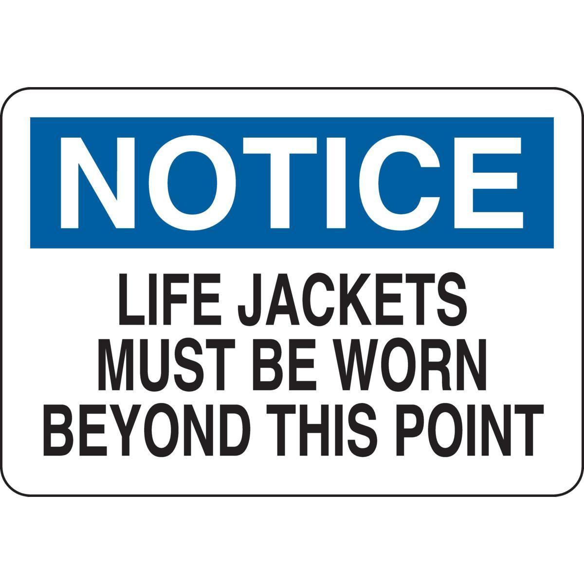 - Header:NOTICEHeight:7 inLegend:LIFE JACKETS MUST BE WORN BEYOND THIS POINTLegend Style:TextLegend/Background Color:Black/Blue on WhiteMaterial:B-555 AluminumMounting Type:FastenedType:RectangularWidth:10 in