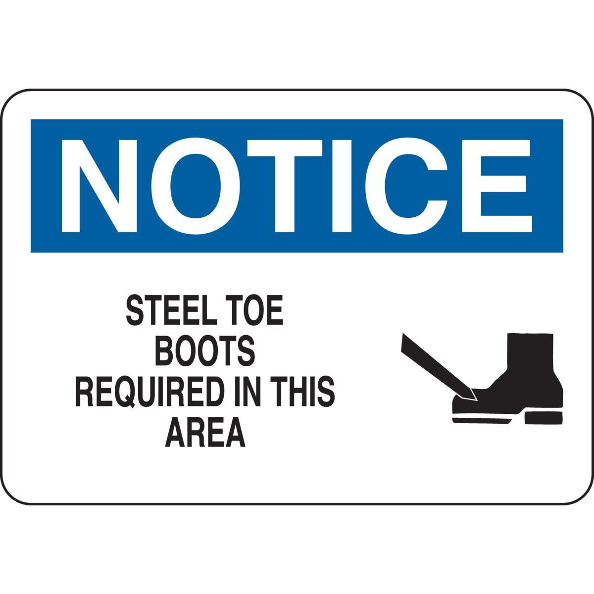 - Header:NOTICEHeight:7 inLegend:STEEL TOE SHOES REQUIRED IN THIS AREALegend Style:Symbol/TextLegend/Background Color:Black/Blue on WhiteMaterial:B-302 PolyesterMounting Type:AdhesiveType:Laminated RectangularWidth:10 in