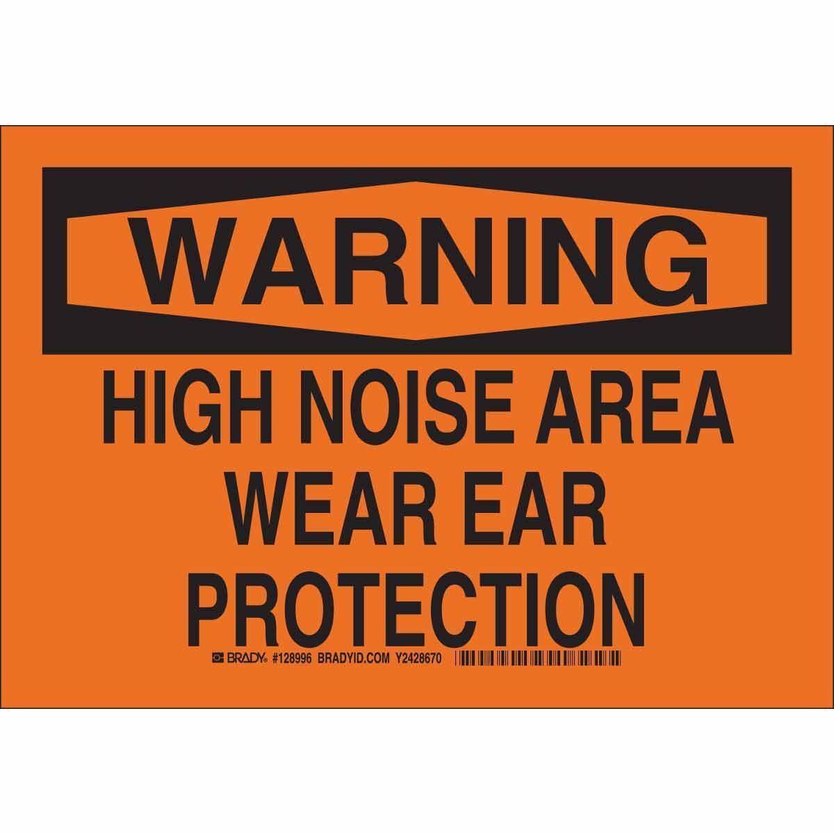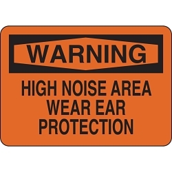 - Header:WARNINGHeight:7 inLegend:HIGH NOISE AREA WEAR EAR PROTECTIONLegend Style:TextLegend/Background Color:Black on OrangeMaterial:B-555 AluminumMounting Type:FastenedType:RectangularWidth:10 in