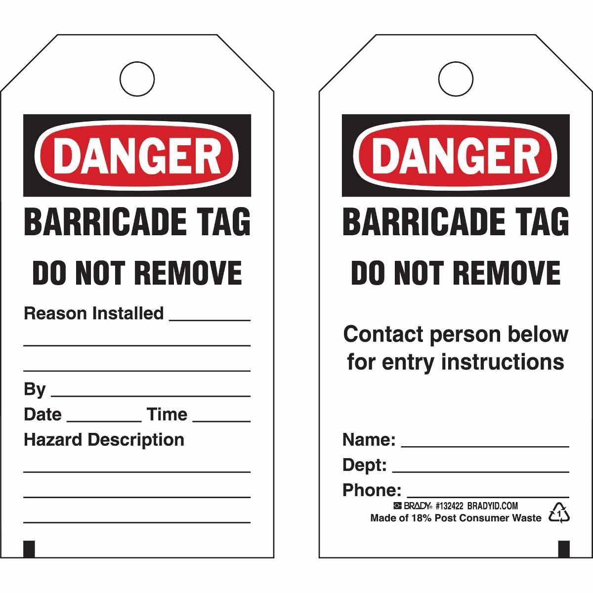 - Country of Origin:USGrommet Type:BrassHeight:5-3/4 inHole Size:3/8 inLegend:Front: DANGER BARRICADE TAG DO NOT REMOVE CONTACT PERSON BELOW FOR ENTRY INSTRUCTIONS NAME:DEPT:PHONE Back: DANGER BARRICADE TAG DO NOT REMOVE REASON INSTALLED:BY:DATE:TIME:HAZARD DESCRIPTIONLegend/Background Color:Black/Red on WhiteManufacturer Name:Brady WorldwideMaterial:B-851 PolyesterType:2-Sided RectangularWidth:3 inWithstand Pull Force:50 lb