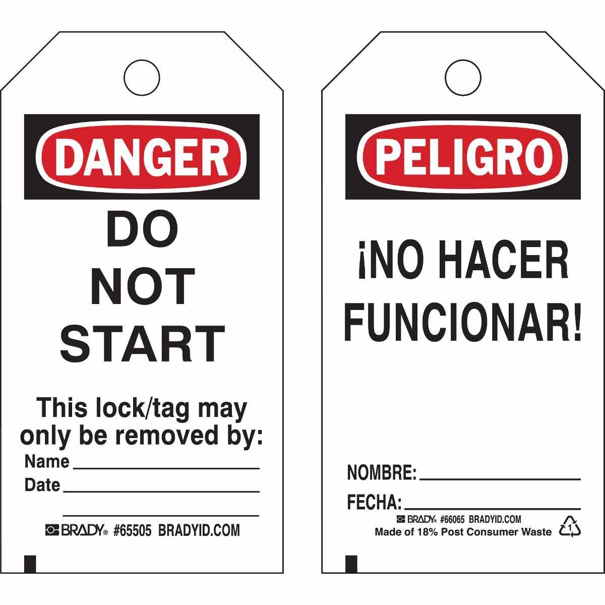 - Country of Origin:USHeight:5-3/4 inHole Size:3/8 inLegend:Do Not Start This Lock/Tag May Only Be Removed ByLegend/Background Color:Black/Red on WhiteManufacturer Name:Brady WorldwideMaterial:B-853 Paper CardstockWidth:3 inWithstand Pull Force:50 lb