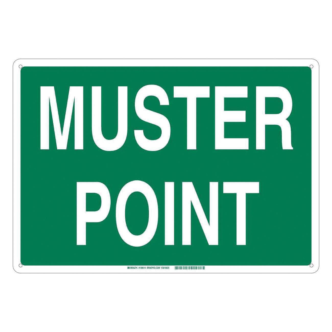 Brady 139620 Rectangular Muster Point Sign, No Header, 14 in H 20 in W, White on Green, B-555 Aluminum, Fastened Mount
