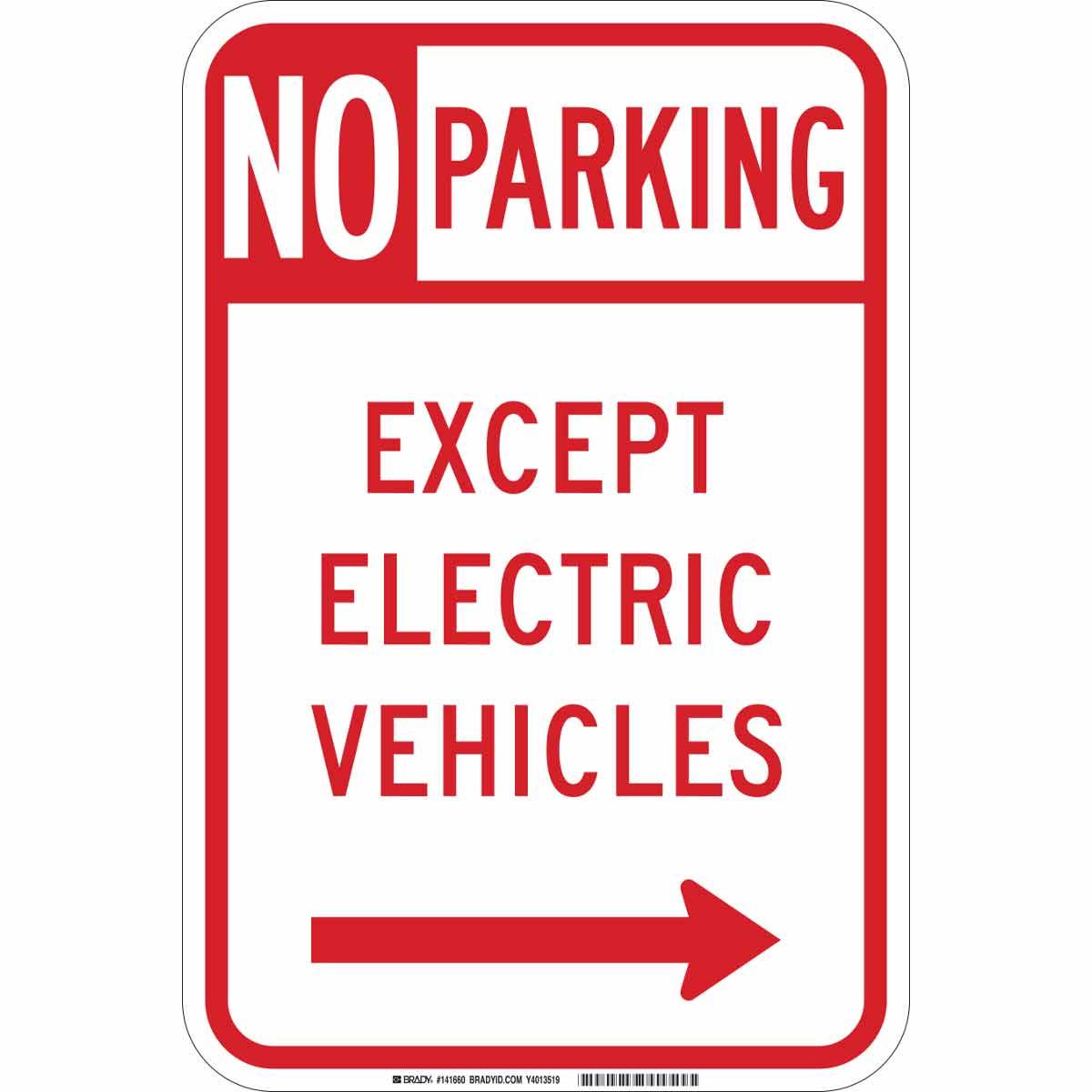 - Height:18 inLegend:NO PARKING EXCEPT ELECTRIC VEHICLES with Right Arrow SymbolLegend Style:Symbol/TextLegend/Background Color:Red on WhiteMaterial:B-959 AluminumMounting Type:FastenedType:RectangularWidth:12 in