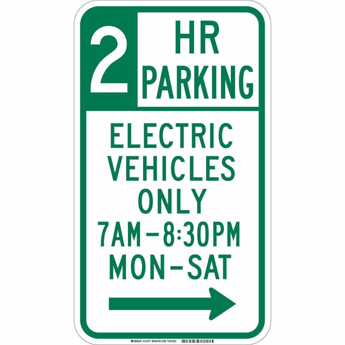 - Height:18 inLegend:2 HR PARKING ELECTRIC VEHICLES ONLY 7 AM- 8:30 PM MON-SAT with Right Arrow SymbolLegend Style:Symbol/TextLegend/Background Color:Green on WhiteMaterial:B-959 AluminumMounting Type:FastenedType:RectangularWidth:12 in