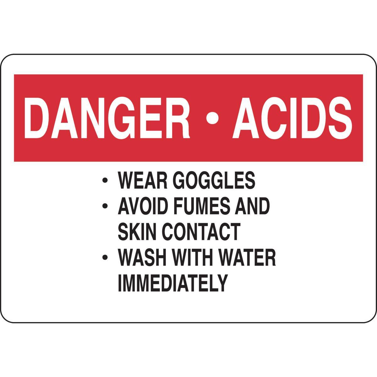 - Header:DANGER ACIDSHeight:10 inLegend:WEAR GOGGLES AVOID FUMES AND SKIN CONTACT WASH WITH WATER IMMEDIATELYLegend/Background Color:Black/Red on WhiteMaterial:B-302 PolyesterMounting Type:AdhesiveType:Laminated RectangularWidth:14 in