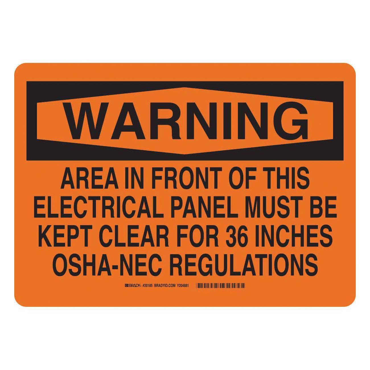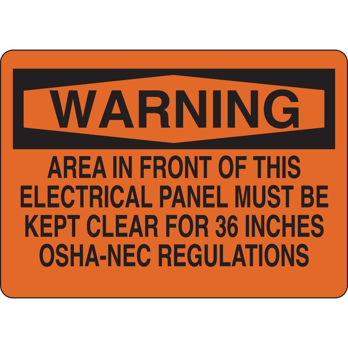 - Header:WARNINGHeight:10 inLegend:AREA IN FRONT OF THIS ELECTRICAL PANEL MEST BE KEPT CLEAR FOR 36 INCHESLegend/Background Color:Black on OrangeMaterial:B-140 Fiberglass/PolyesterMounting Type:FastenedType:Laminated RectangularWidth:14 in