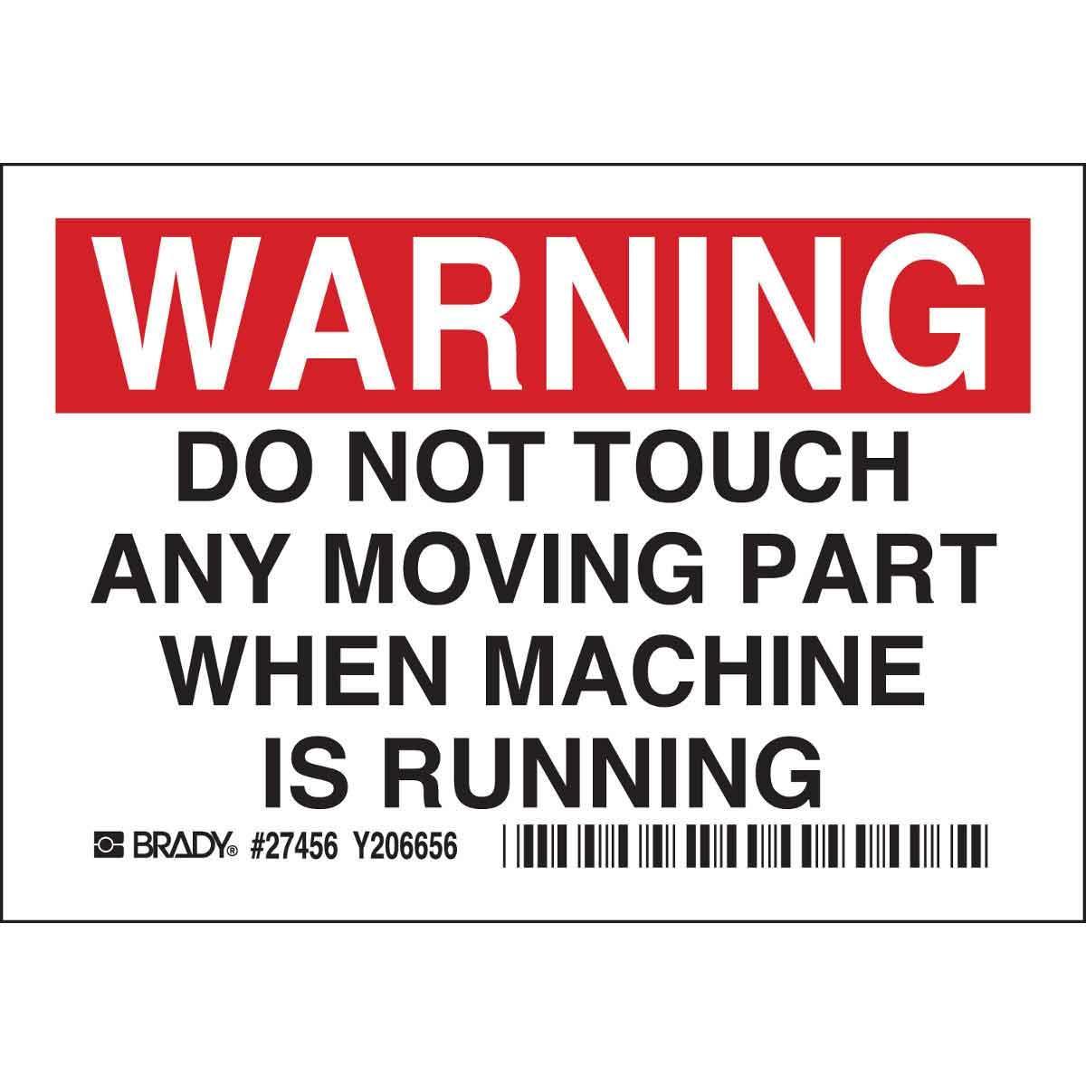 - Height:3-1/2 inLegend:DO NOT TOUGH ANY MOVING PART WHEN MACHINE IS RUNNINGLegend/Background Color:Black/Red on WhiteMaterial:B-302 PolyesterMounting Type:AdhesiveType:High Performance RectangularWidth:5 in